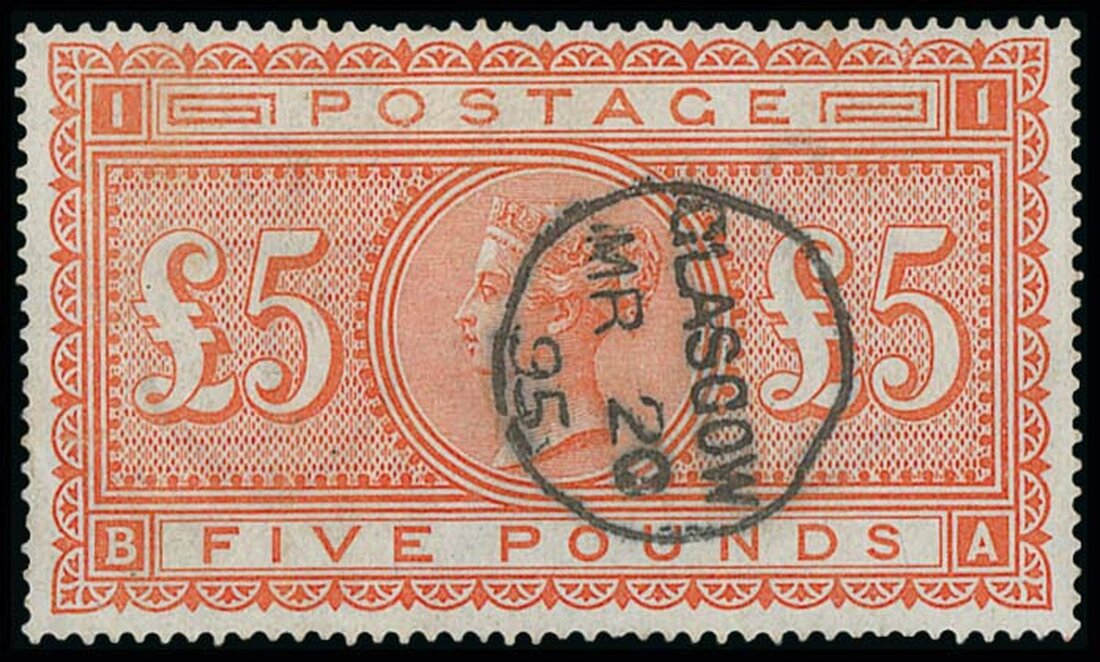 £5 orange, BA cancelled by Glasgow 20.03.95 d.s., small fault at top and diagonal bend at right. Rare. S.G. 137, £3,750