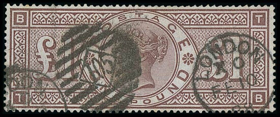 £1 brown-lilac, TB, cancelled by London '105' 10.02.88 duplex; some reduced markings otherwise fine and a rare stamp. S.G. 186, £3,500