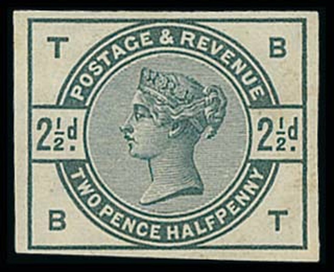 2½d. imperforate colour trial in deep greenish grey on white, watermarked paper, lettered BT; very fine and rare.