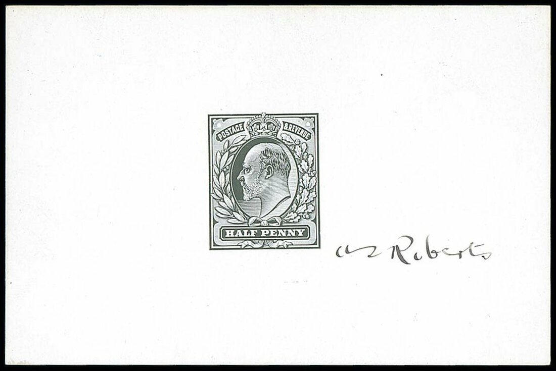 1901 ½d. die proof in black on white glazed card (c.92x60mm.), endorsed in manuscript "A.S. Roberts". Very fine and scarce.