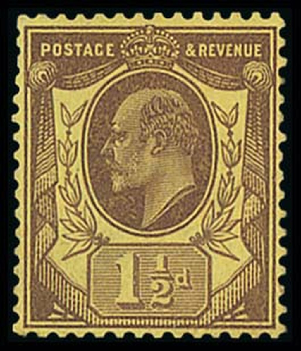 1½d. colour trial in dull purple on yellow, perforated 14, watermark crown paper, large part original gum, very fine and rare. Spec. £9,000