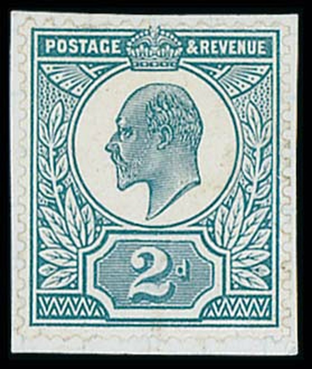 2d. colour trial in dull blue green, perforated 14 and affixed to small piece of card. Fine and rare. Spec. £9,000