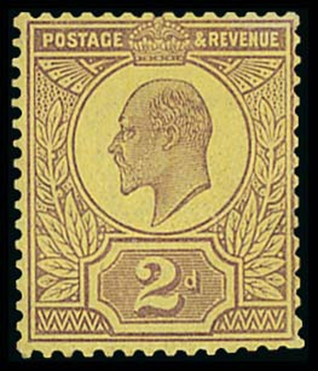 2d. colour trial in dull purple on yellow paper perforated 14, watermark crown, very lightly mounted; one or two trimmed perfs at lower right otherwise fine and rare. Spec. £9,000