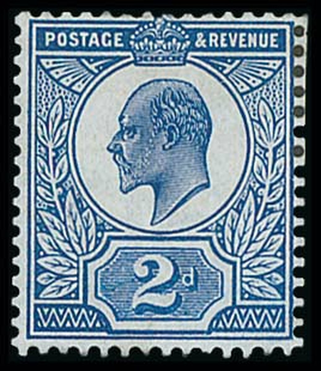 2d. colour trial in deep blue on white paper perforate 14, watermark crown with large part original gum. Very fine and rare. Spec. £9,000
