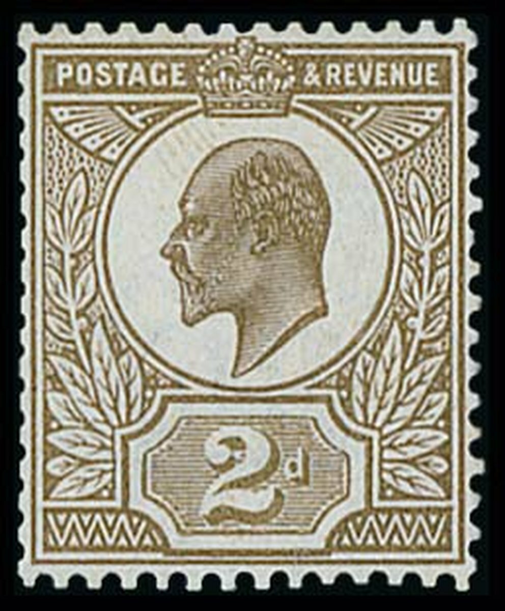 2d. colour trial in olive-brown, perforated 14 on watermark crown paper, large part original gum; some trimmed perfs. fine and rare. Spec. £9,000