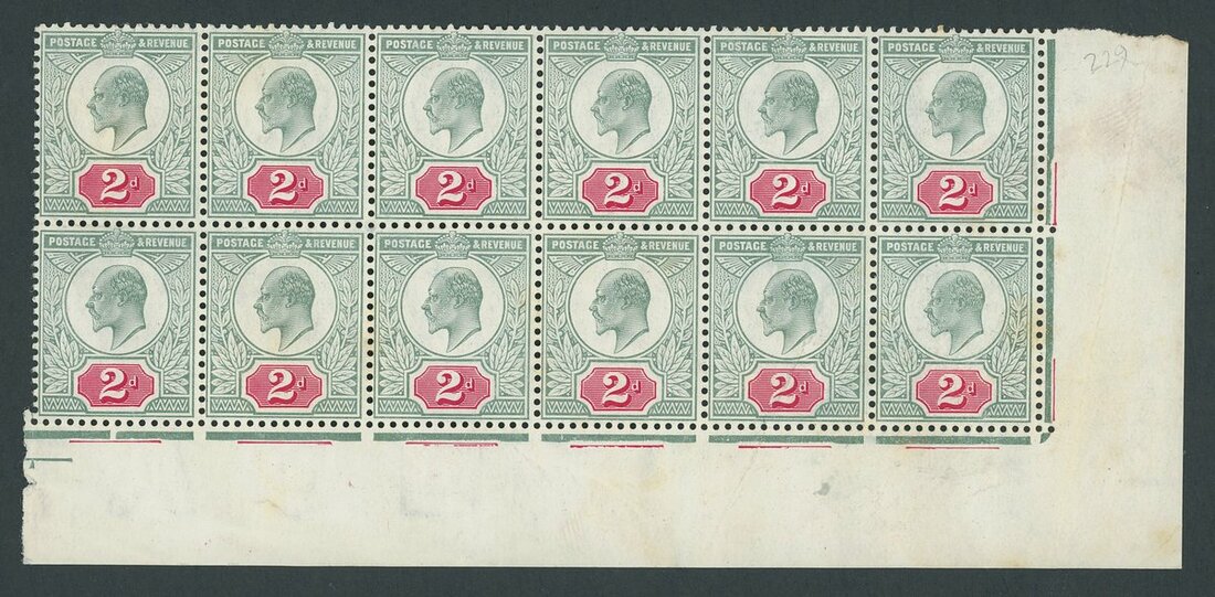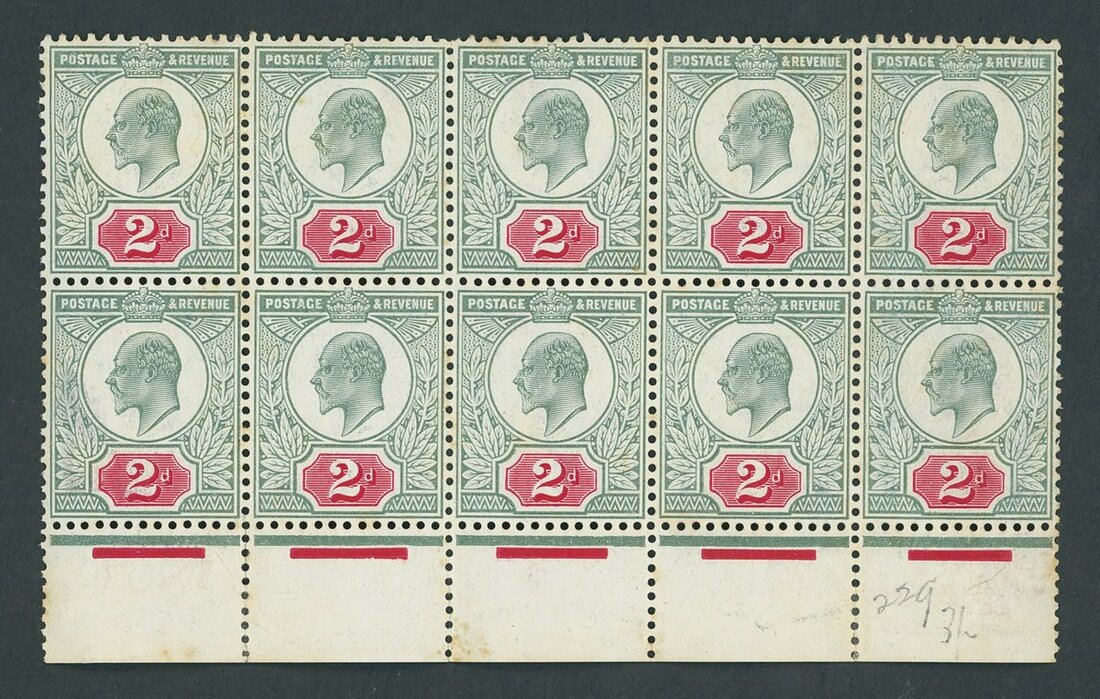 2d., chalky paper pale grey-green and scarlet marginal block of twelve (6x2) and ten (5x2), the former in 'bright scarlet' shade, mounted on one stamp only, the latter in 'deep bright scarlet' shade, mounted on two stamps only; both with some overall foxing nevertheless attractive and rare multiples. Spec. c.£2,000++
