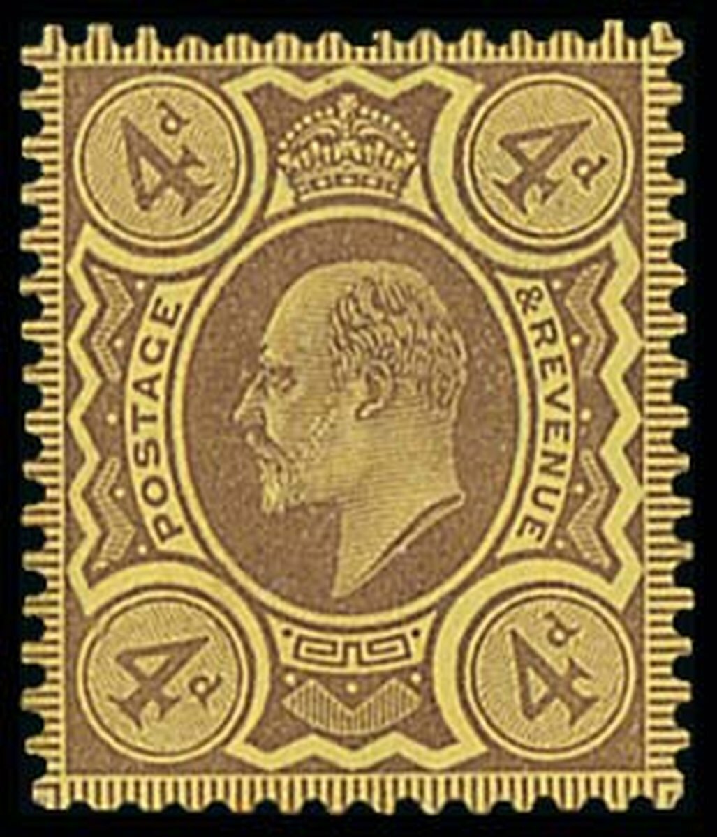 4d. colour trial in purple on yellow paper perforated 14, watermark crown, large part original gum, very fine and rare. Spec. £9,000