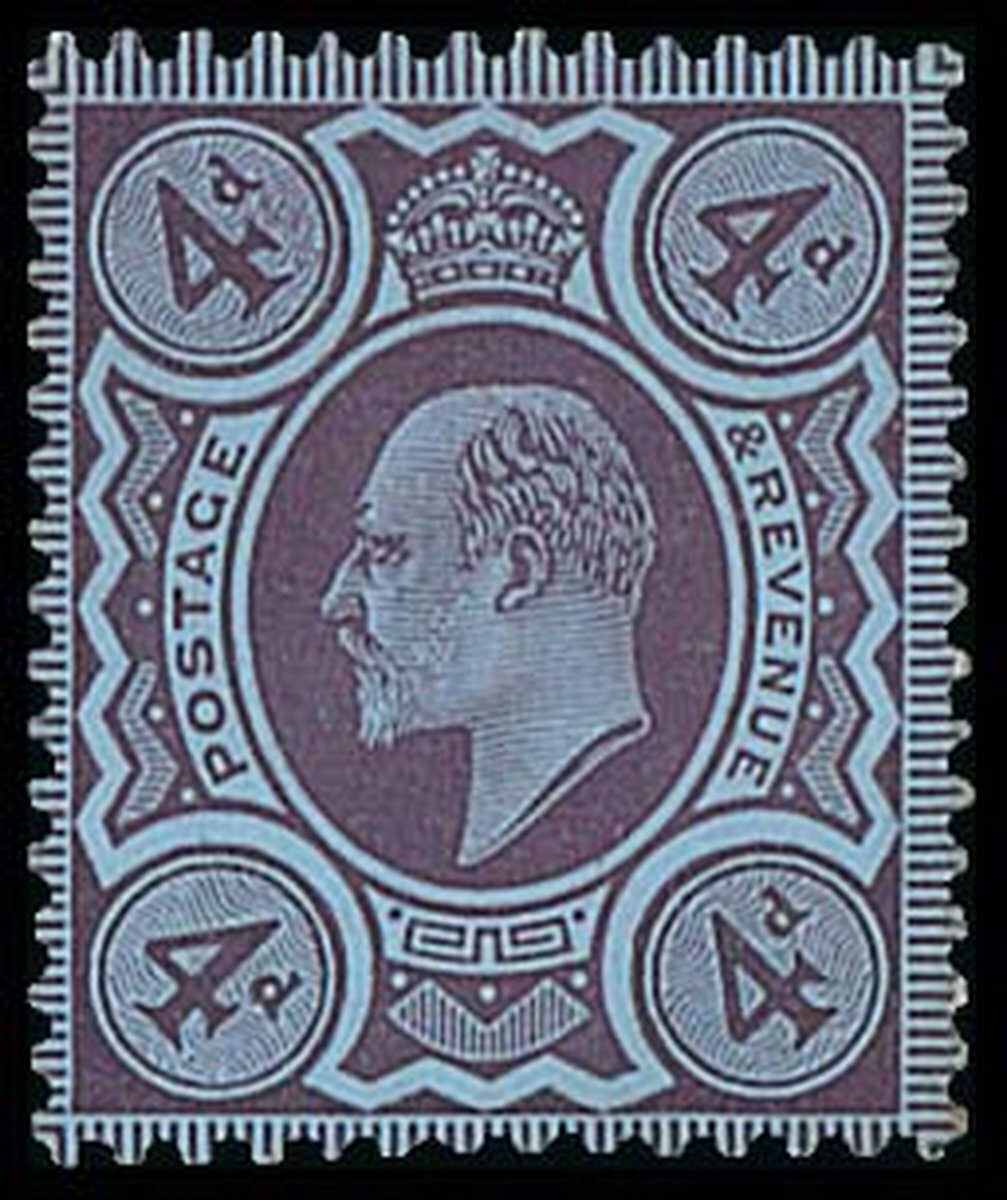 4d. colour trial in deep purple on blue tinted paper perforated 14, without watermark, large part original gum. Fine and rare. Spec. £9,000