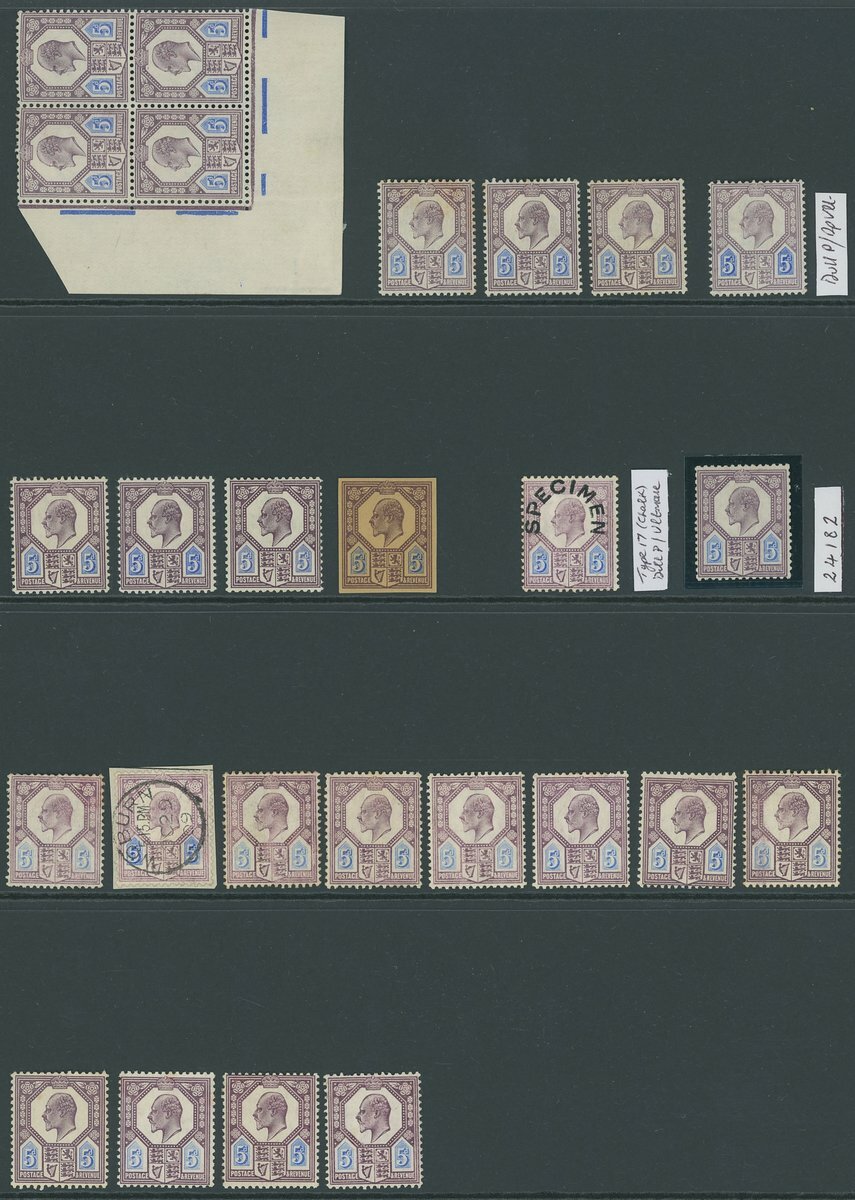 5d. ordinary paper dull purple and ultramarine plate proof on buff paper with issued shades accross four singles and superb corner marginal block of four, slate-purple and ultramarine (3), two unmounted; also chalk surfaced paper specimen overprinted "