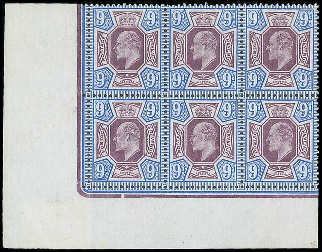 9d. dull purple and ultramarine on chalk surfaced paper, block of six (3x2) from the lower left corner of the sheet with date cut below the lower left stamp, original gum with five remaining unmounted mint; fine and fresh. Specialised M40 (1), £1,490.