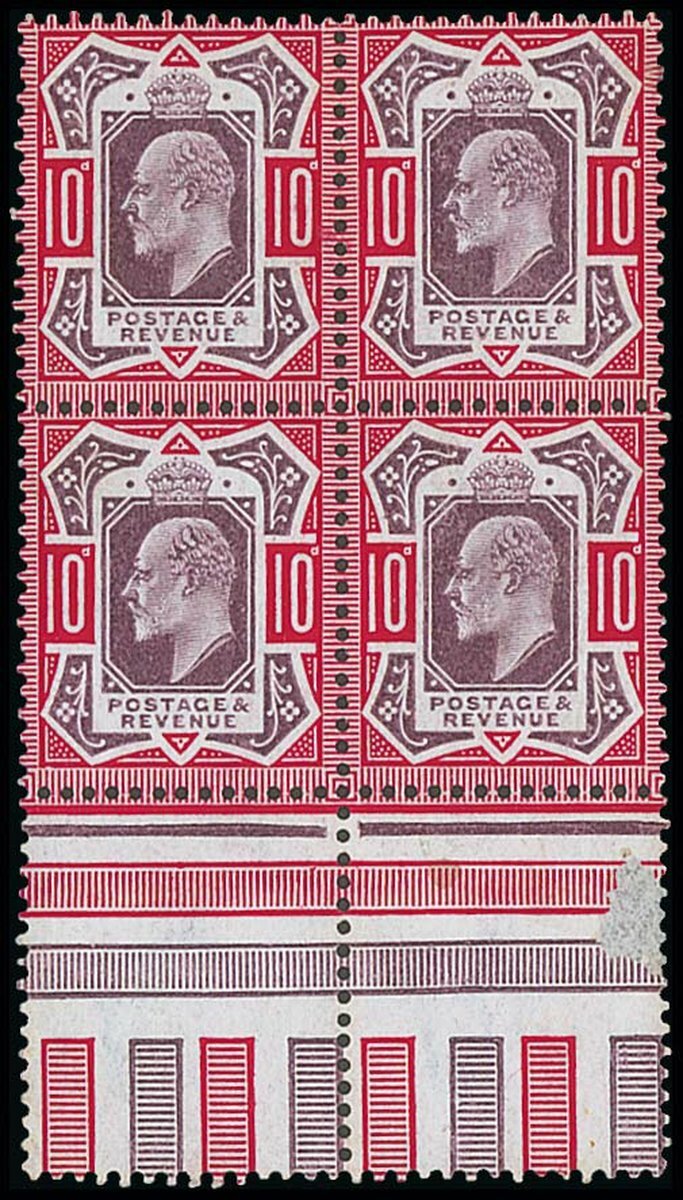 10d. dull purple and scarlet on chalk surfaced paper block of four with interpanneau margin at foot where there is a thin; superb unmounted mint and a wonderful example of this difficult shade. S.G. M43(5), £1,300++