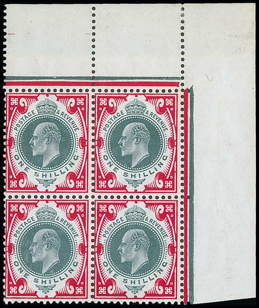 1/- dull green and carmine on chalk surfaced paper, a corner marginal block of four from the upper right of the sheet; superb unmounted mint, of magnificent colour and a rare multiple. Spec. M46(1), £1,100