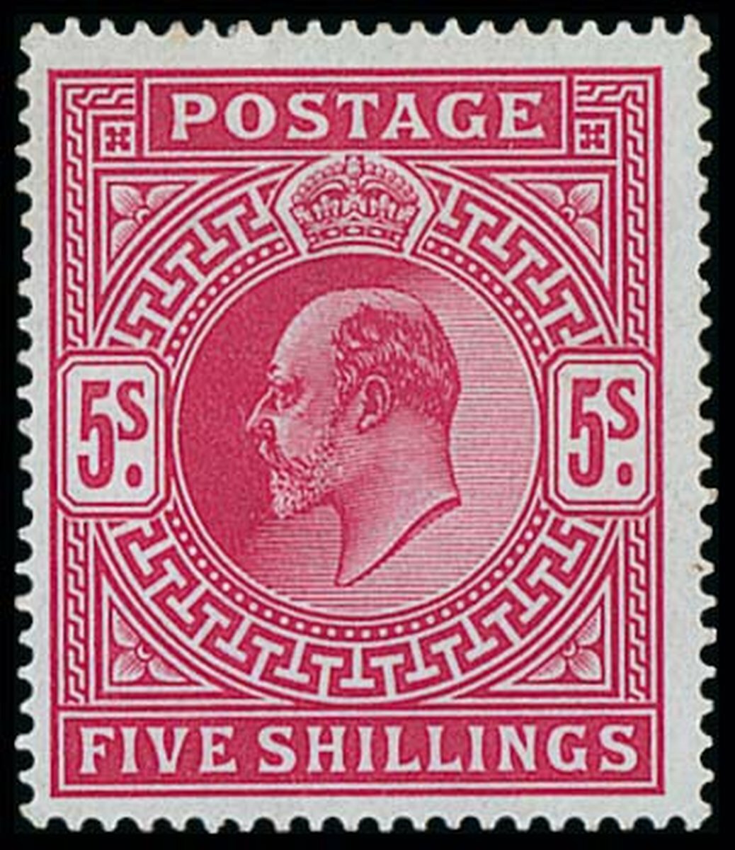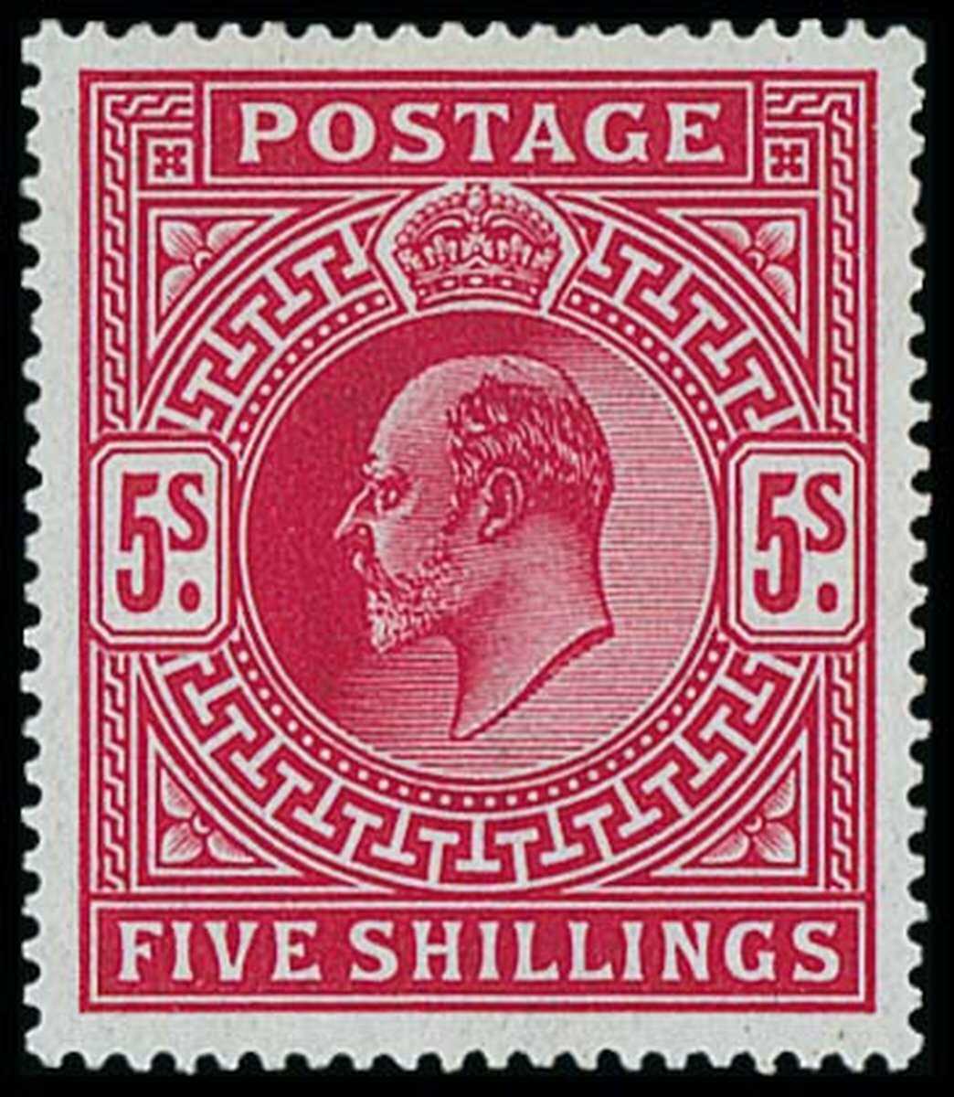 5/- (2) bright carmine and deep bright carmine, both fluorescing "cherry" red under UV, large part original gum; fine and rare. Spec. M51