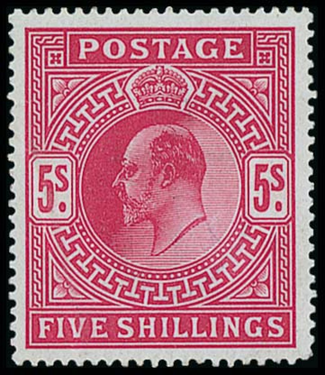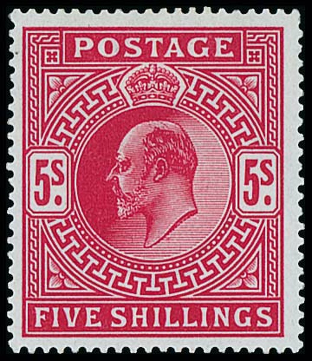 5/- (2) bright carmine and deep bright carmine, both fluorescing "cherry" red under UV, large part original gum; fine and rare. Spec. M51