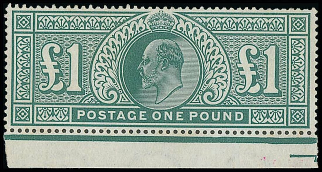 £1 dull blue-green with part sheet margin at foot, superb unmounted mint and rare as such. A most attractive stamp. Spec. M55, S.G. 266 £2,500