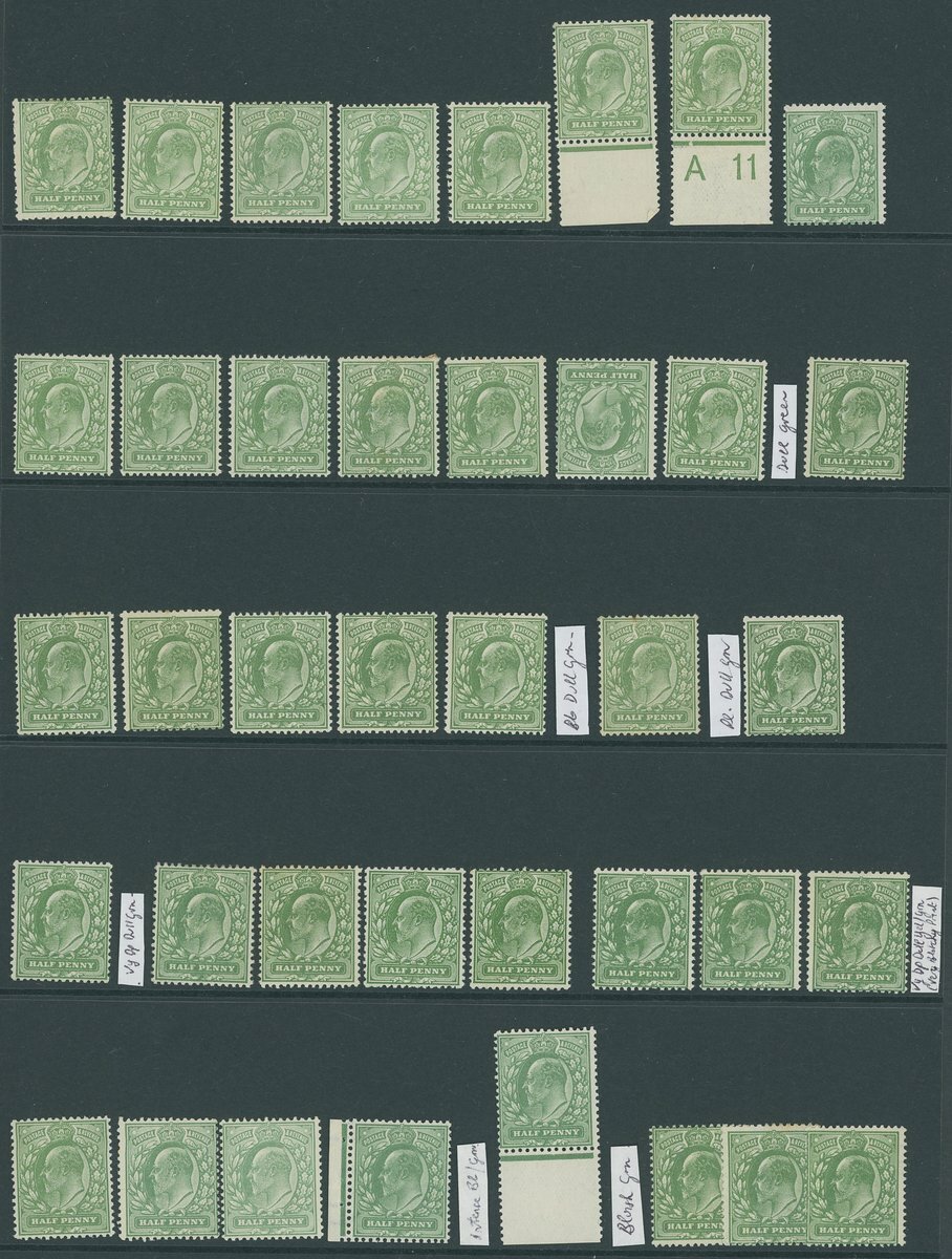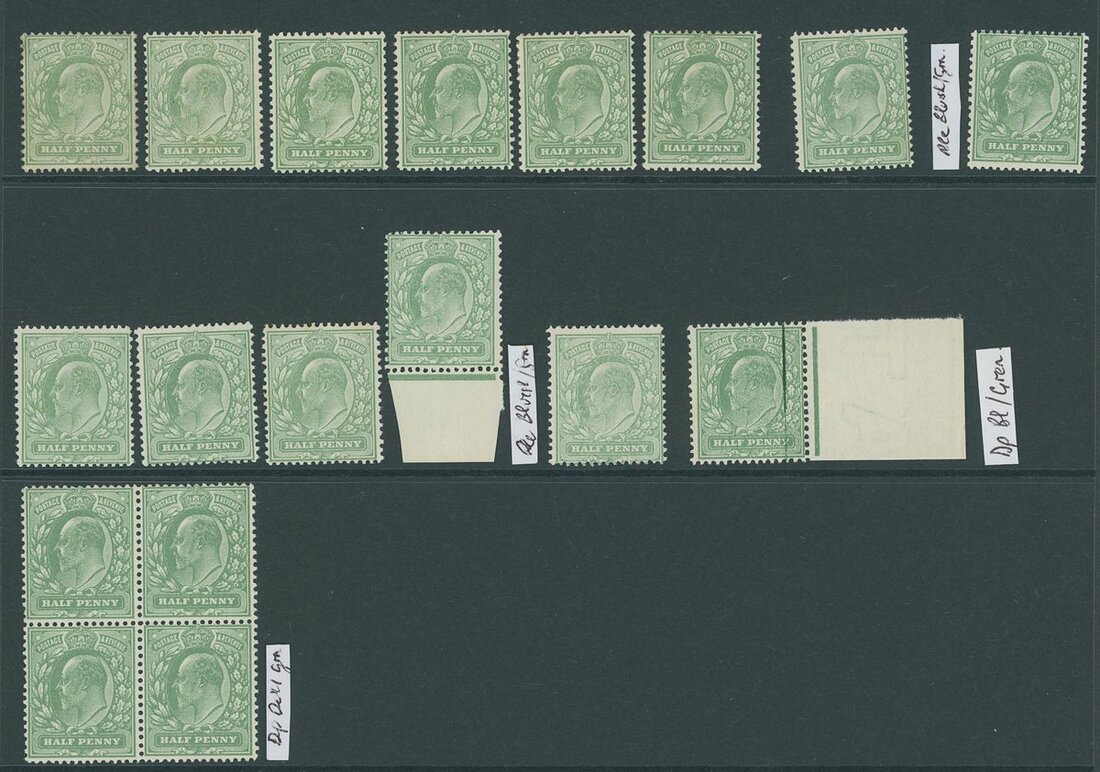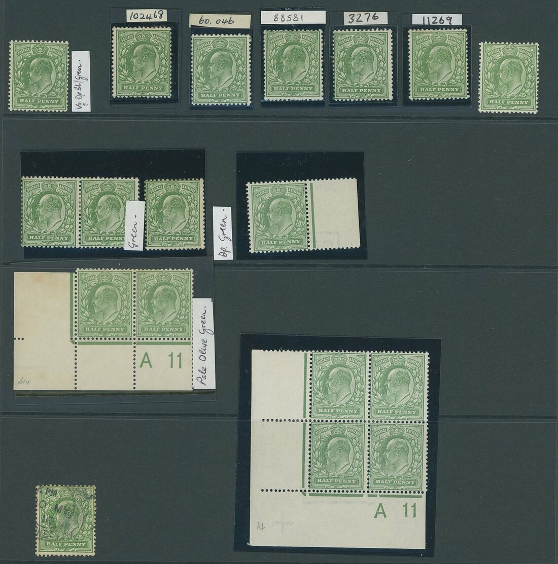 Perf. 14 ½d. mint range (56) across all shades with variations including very blotchy print (3), 'very deep' dull green, 'intense' blue-green, bright green (fine impression) (2), deep bright green (2), one unmounted, and 'pale bright green', all with Certificates R.P.S. or Hendon, 'pale olive-green' "