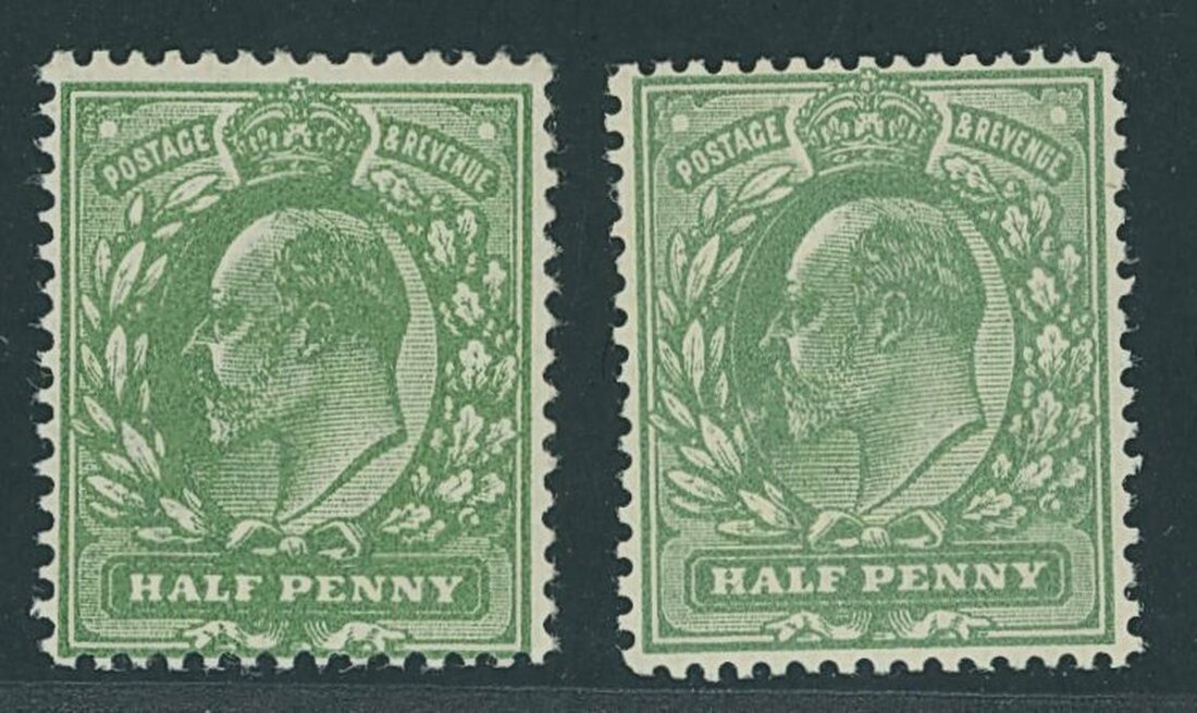 Perf. 14 and perf. 15x14 ½d. deep dull yellow-green (very blotchy print); the former in deep shade, unmounted mint with R.P.S. Certificate (1992), a copy from when a block of four, the latter large part original gum. Fine and scarce. Spec. M3(4), M4(3), £775