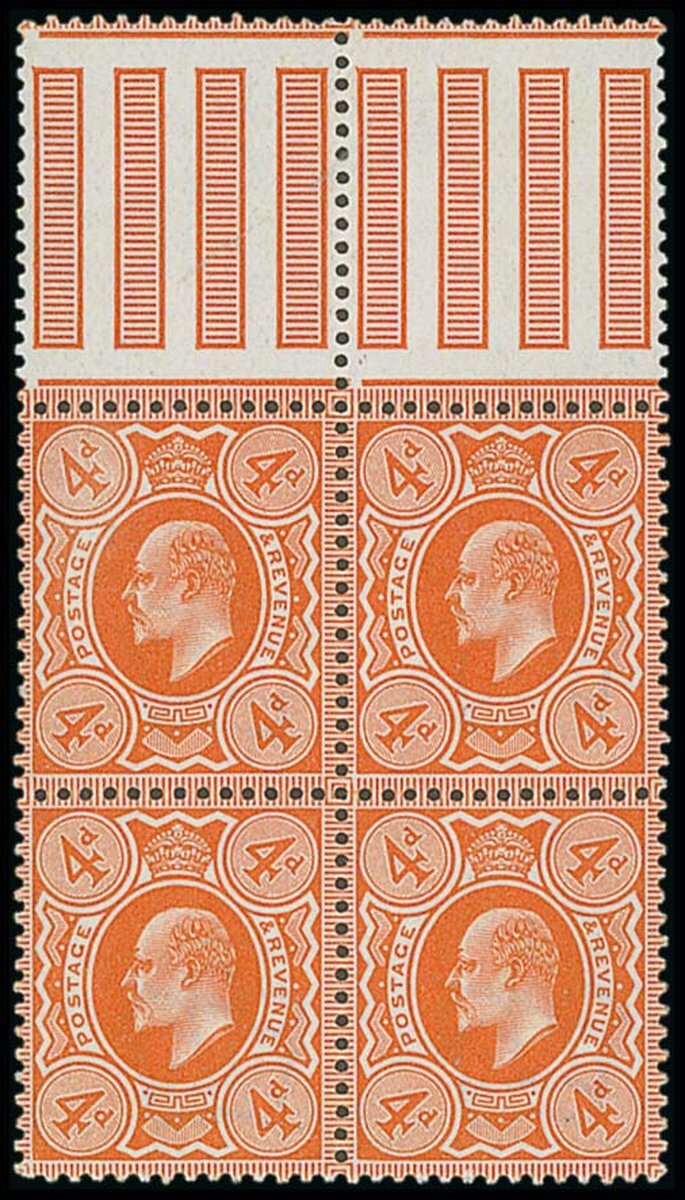 Perf. 14 4d. bright orange block of four with interpanneau margin at top, superb unmounted mint and of wonderful, fresh colour. Spec. M26(1), £1,100