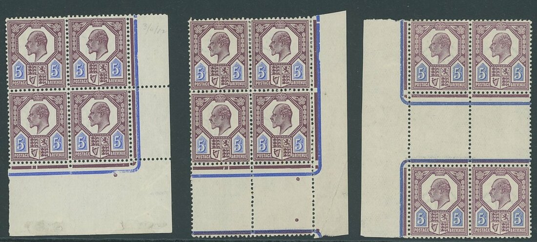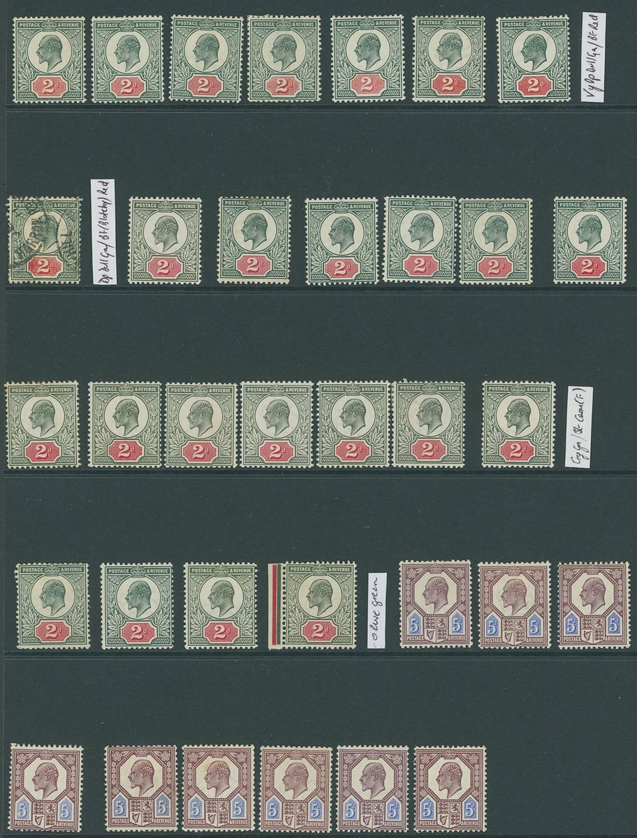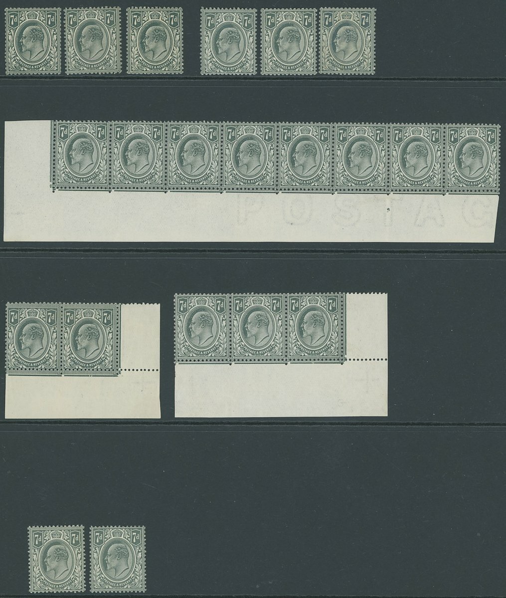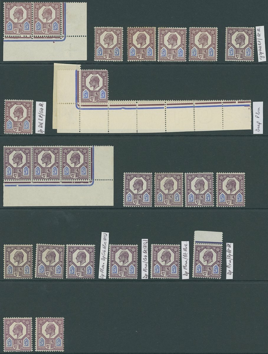 2d. mint range (24) including deep dull green and red (12, plus one used with 'blotchy' red print) with very deep dull green shades and single with deep red value tablet, dull green and carmine / bright carmine (5), grey-green and bright carmine (6), grey-green and bright carmine (F), and two 'olive-green' and carmine; 5d. (45) with dull reddish purple and cobalt (3), dull reddish purple and bright blue, deep dull reddish purple and bright blue with two corner marginal blocks of four, deep plum and cobalt with interpanneau block of four, deep plum and cobalt-blue (F) (2); and 7d. deep slate-grey (3), slate-grey (3) plus corner marginal horizontal strip of eight, and pale grey marginal strip of three and pair. Generally very fine, with a few per value unmounted mint. Spec. c.£3,290