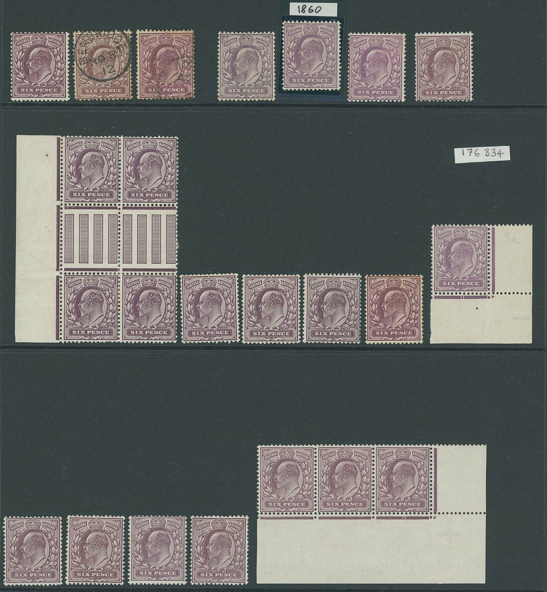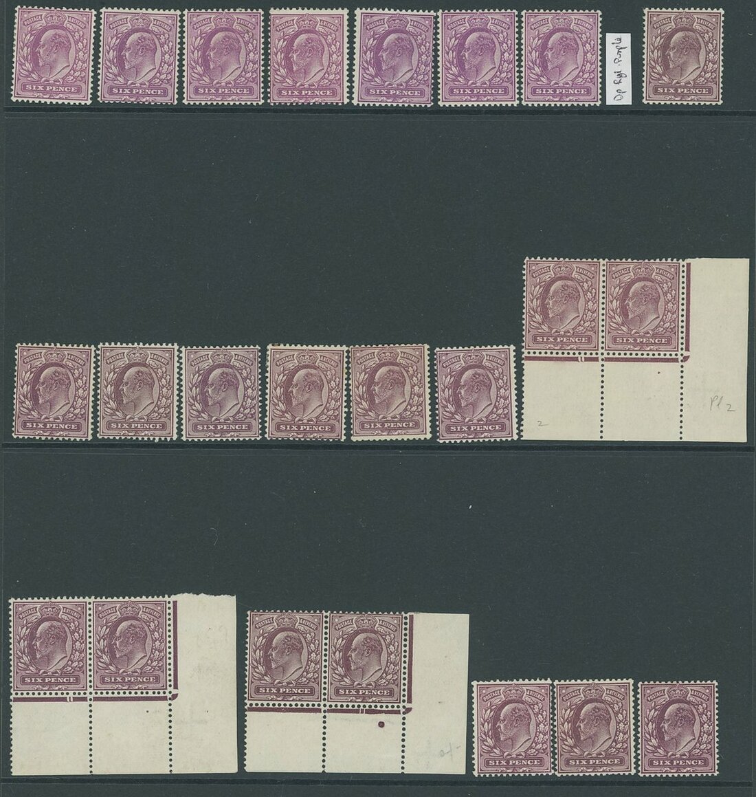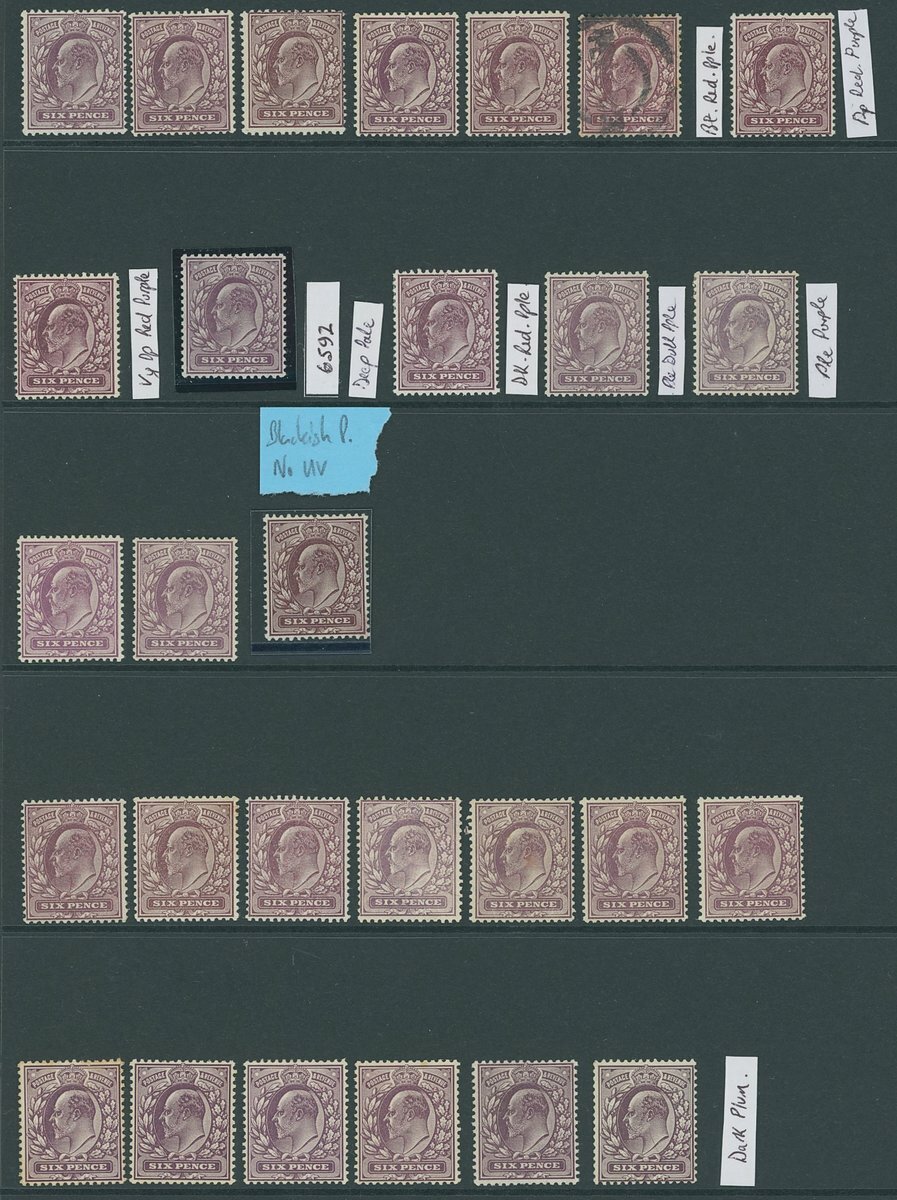 6d. mint range with ordinary paper, fluorescent ink (38) including royal purple (7), reddish purple (9 including marginal pair), dark reddish purple (8 including two marginal pairs), dull purple (F), dull lilac (F) (3, one in reddish shade), one with Hendon Certificate (1991), marginal 'dull violet' (F) with R.P.S. Certificate (2000), and dark/black purple (GBF) (8 including interpanneau block of four); ordinary paper (21) across all shades with pale reddish purple marginal strip of three, 'pale deep purple', 'very deep red-purple', reddish purple on blue tinted gum with Hendon Certificate (2010) for when a block of twelve, and blackish purple without UV fluorescence; "Dickinson" coated paper (7); chalk surfaced paper (6), mostly deep plum, one in dark shade, one in paler shade. Generally fine, mostly large part original gum with some unmounted mint. Spec. c.£5,500