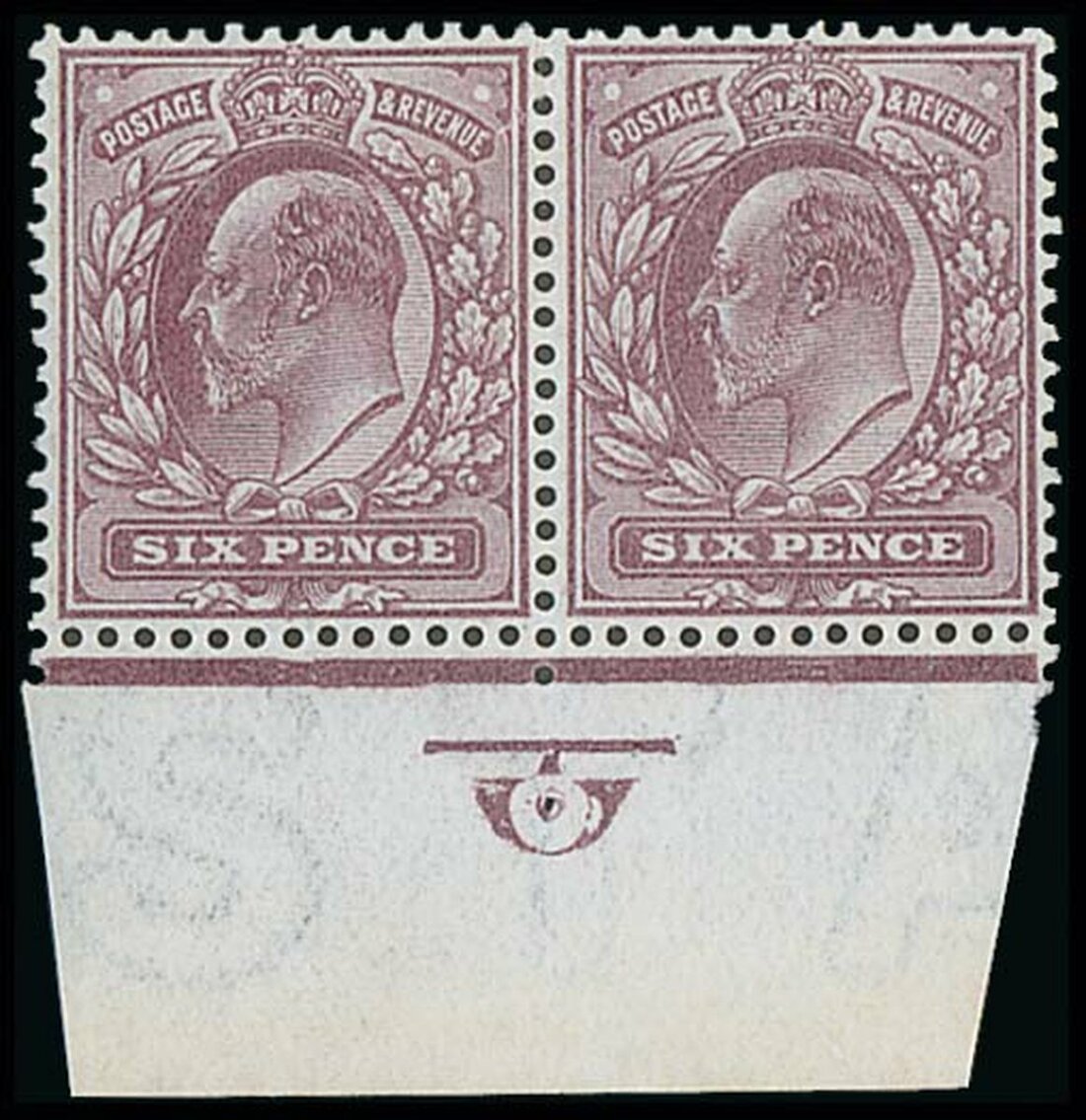 6d. dull purple on "Dickinson" coated paper, a horizontal pair from the foot of the sheet with marginal guide marking, superb unmounted mint and a most attractive multiple. Spec. M34(1), £850