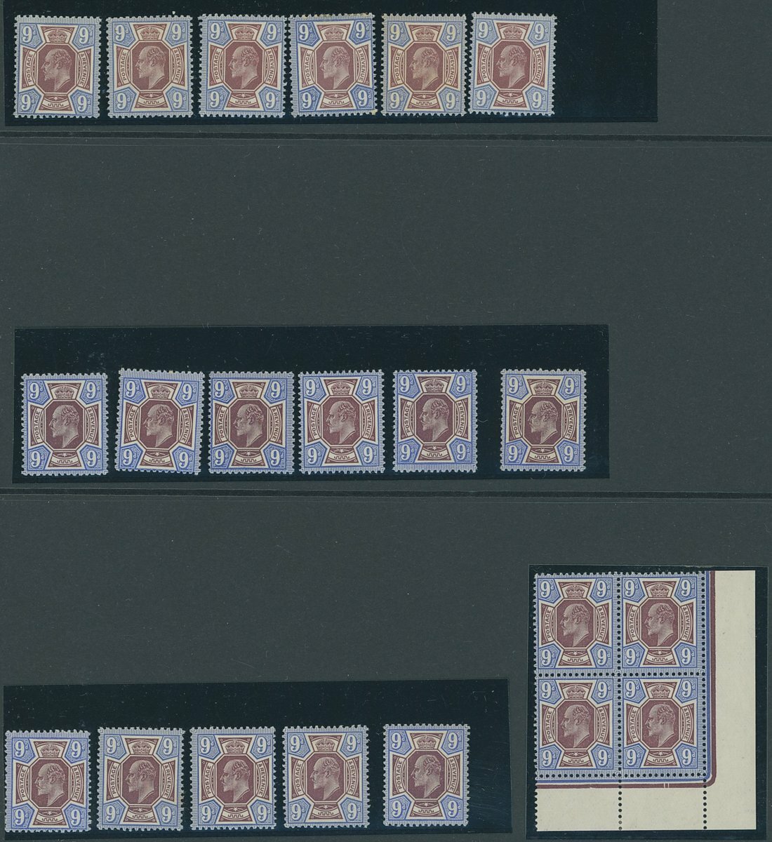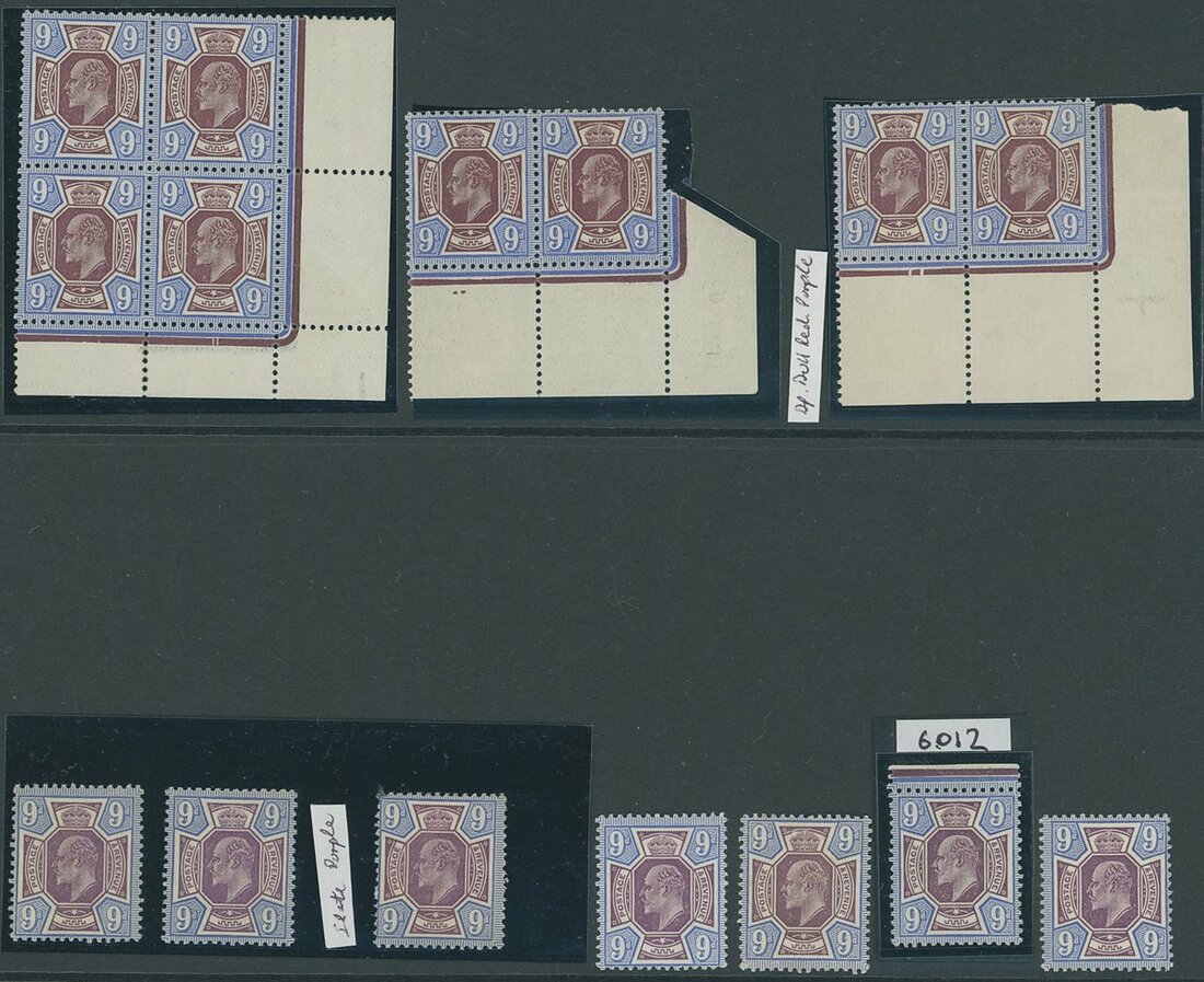 9d. mint range across all shades with reddish purple on light blue (6), deep dull reddish purple on deep bright blue (10, including to pairs), dull reddish purple and blue (13 including two blocks of four), slate purple and cobalt blue (F) (7), one with Hendon Certificate (2008) for 'greyish purple shade', deep plum and blue (12) including two pairs, one of which in deep plum and cobalt blue shade. Generally fine with many unmounted. Spec. c.£6,700