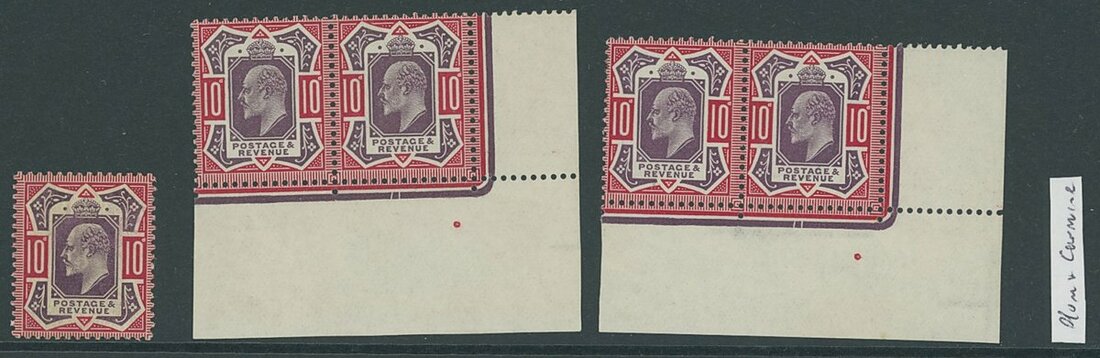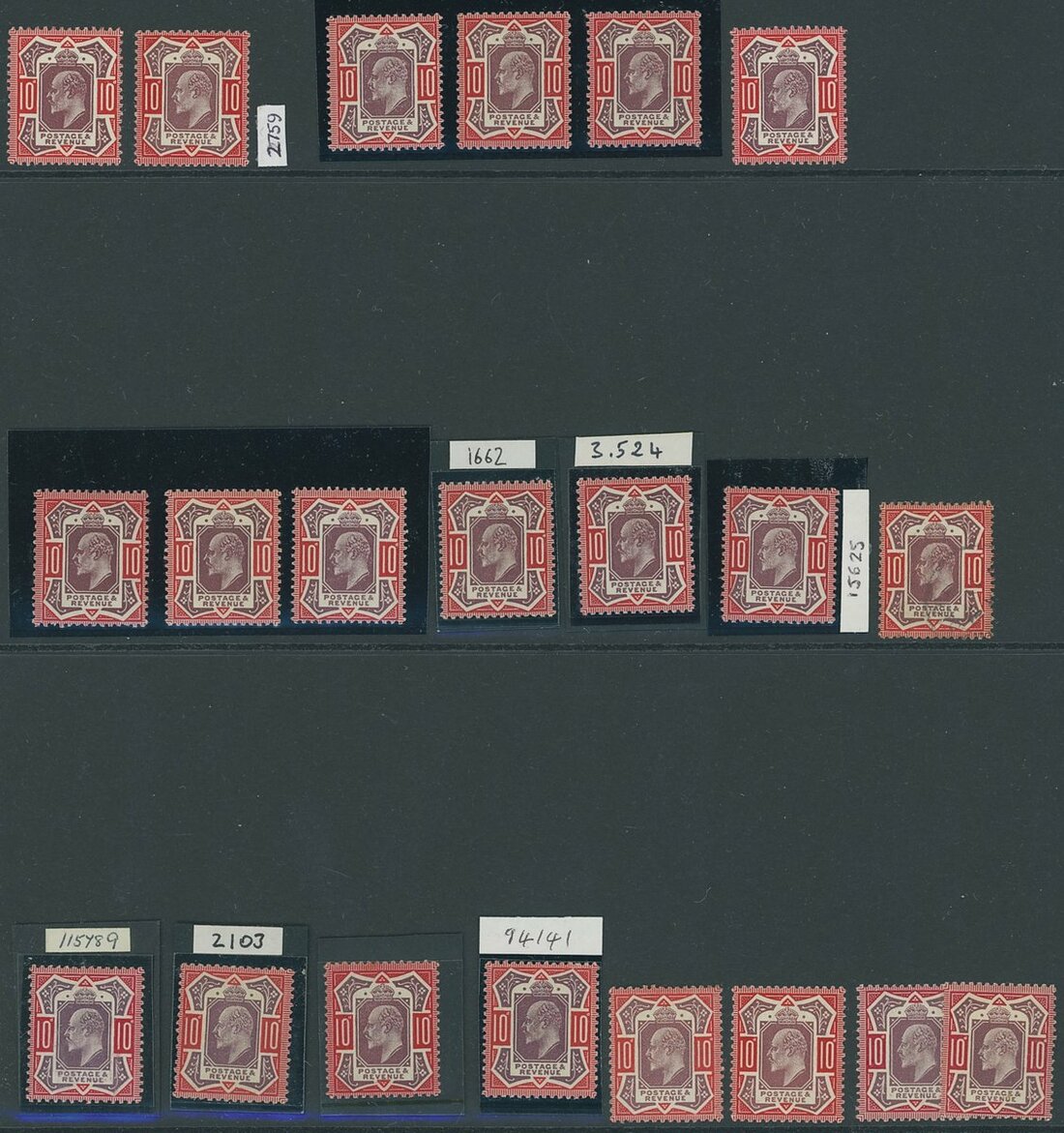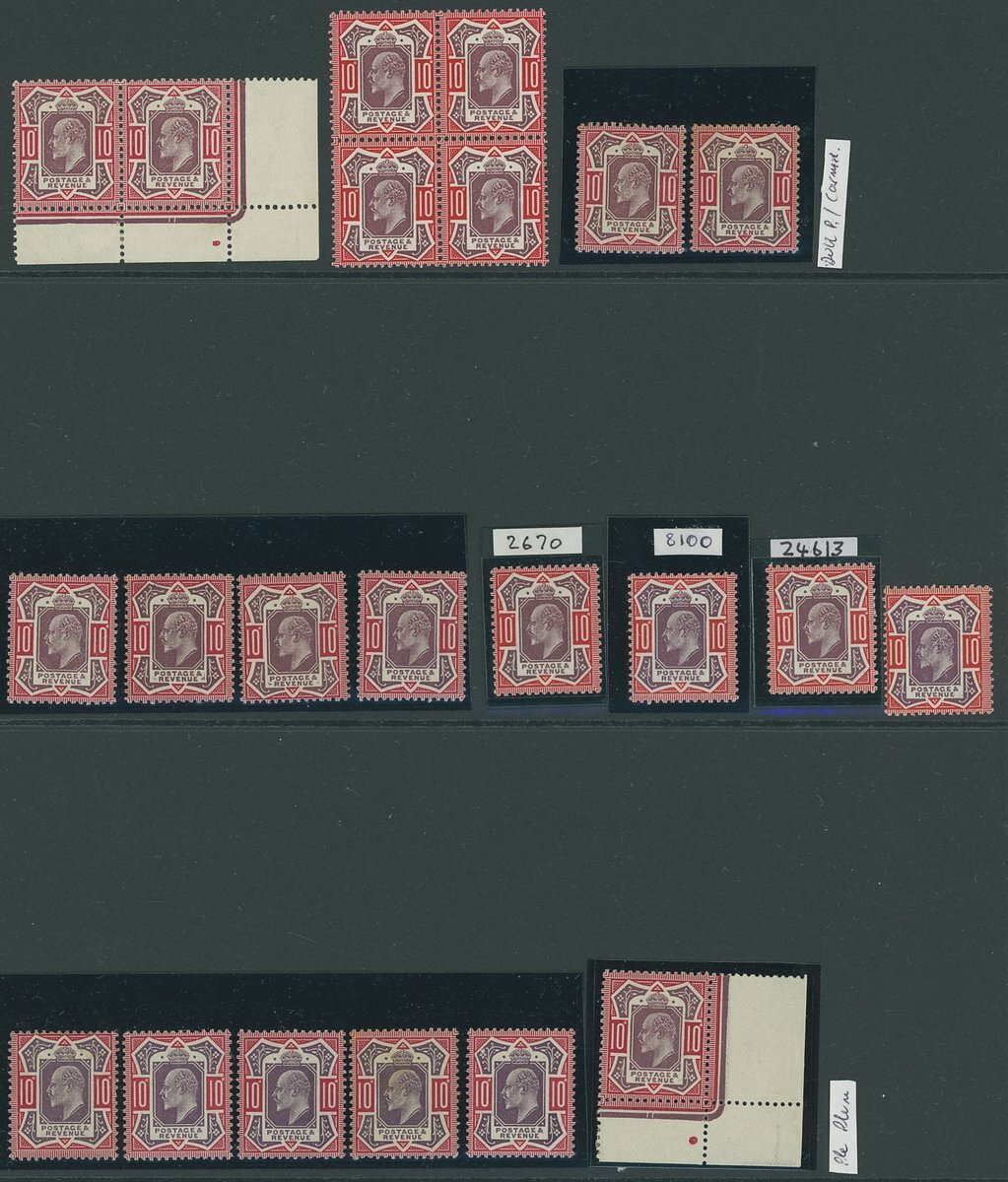 10d. mint range (47) across all shades including certified examples 'dull reddish purple and deep scarlet (2) (both with Hendon), 'dull purple and scarlet' (P.E.G.B.), dull purple and deep scarlet (R.P.S.), dull reddish purple and aniline pink (3) (Brandon, R.P.S. or Hendon), 'dull reddish purple and aniline scarlet' (2) (both Hendon), 'slate purple and pale scarlet' (Hendon); also multiples with dull purple and scarlet block of four, dull purple and carmine marginal pair, 'pale plum and carmine' (two marginal pairs). Generally fine with a few unmounted. Spec. c.£4,800+