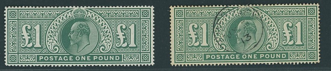 £1 deep green (2), one large part original gum, the other used with some foxing. Scarce. Spec. £2,750
