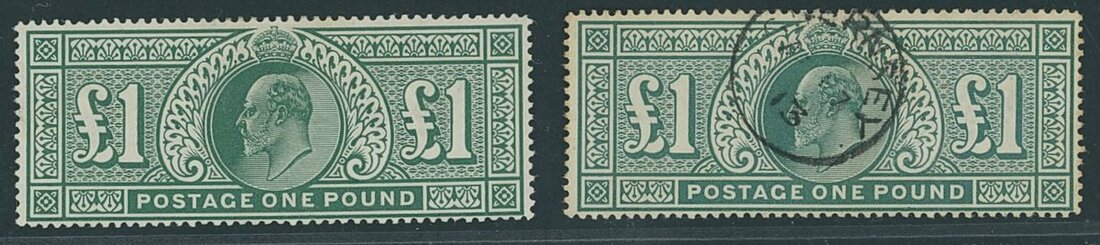 £1 deep green (2), one large part original gum, the other used with some foxing. Scarce. Spec. £2,750