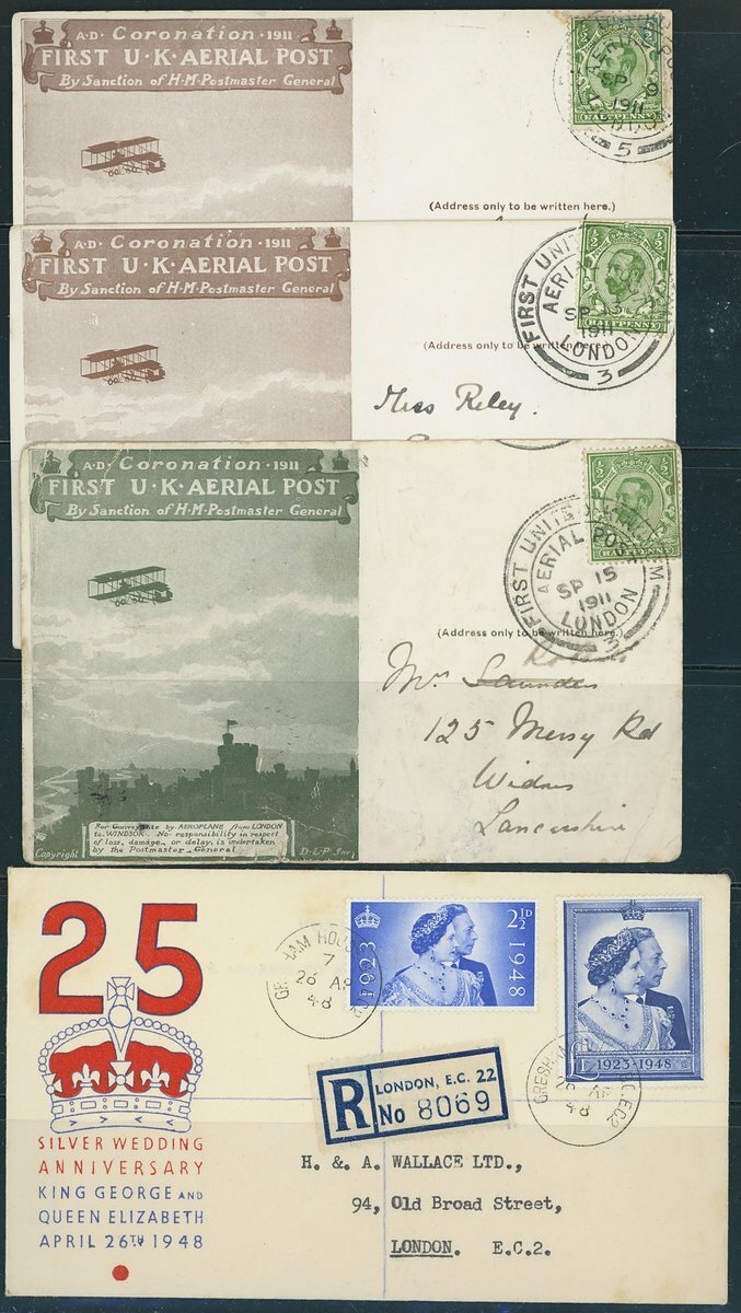 1911 Coronation Aerial Post: Red-Brown card to Inverness, another (with J & J Colman printed advertisement) to Windsor, Olive-green card to Widnes, all franked ½d., good to fine. Also 1948 Silver Wedding set on illustrated first day cover, Registered to London; fine