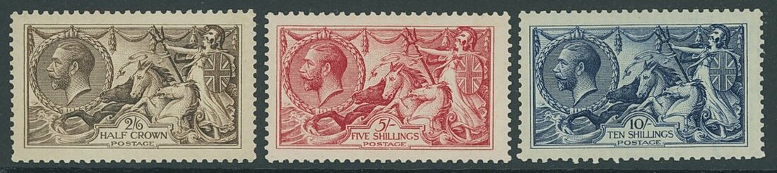 2/6d. sepia-brown, 5/- rose-carmine and 10/- indigo-blue, all fresh large part original gum, the 2/6d. very well centred, and a fine trio. S.G. 400-402