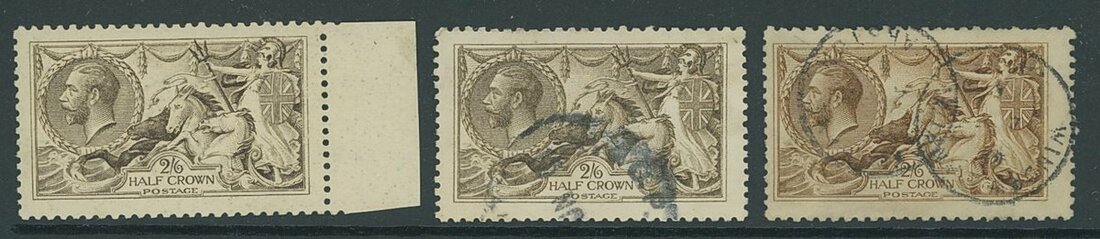 2/6d. Seal-brown with sheet margin at right, unmounted mint on toned gum, with used example, well centred; also yellow-brown single used. Generally fine and a scarce trio. S.G. 406, 408, £1,075