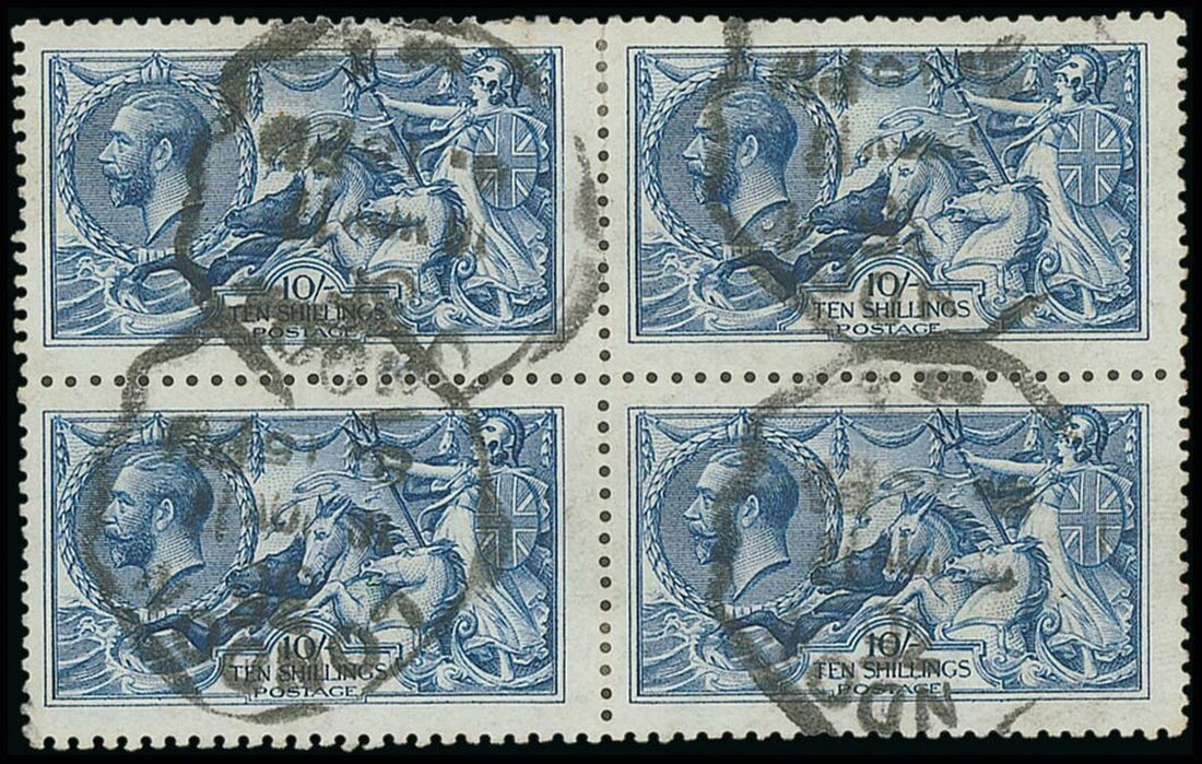 10/- blue block of four cancelled by London 1915 parcel post d.s., fairly well centred, some perf. reinforcements otherwise fine and a rare multiple. S.G. 412, £3,600+