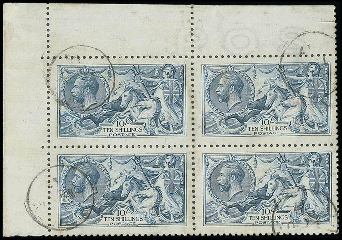 10/- pale blue corner marginal block of four from the upper left of the sheet cancelled by indistinct thimble type d.s., some minor peripheral marking otherwise fine and a rare multiple. S.G. 413, £3,600+