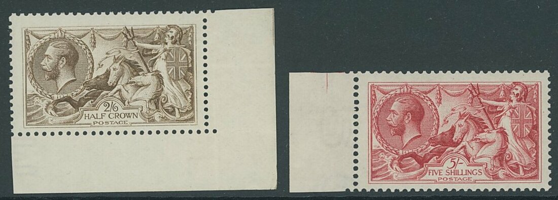 2/6d. pale brown, corner marginal from the lower right of the sheet and 5/- rose-carmine from the left of the sheet showing part guide marking in margin; both unmounted mint and of superb freshness. S.G. 415a, 416, £850
