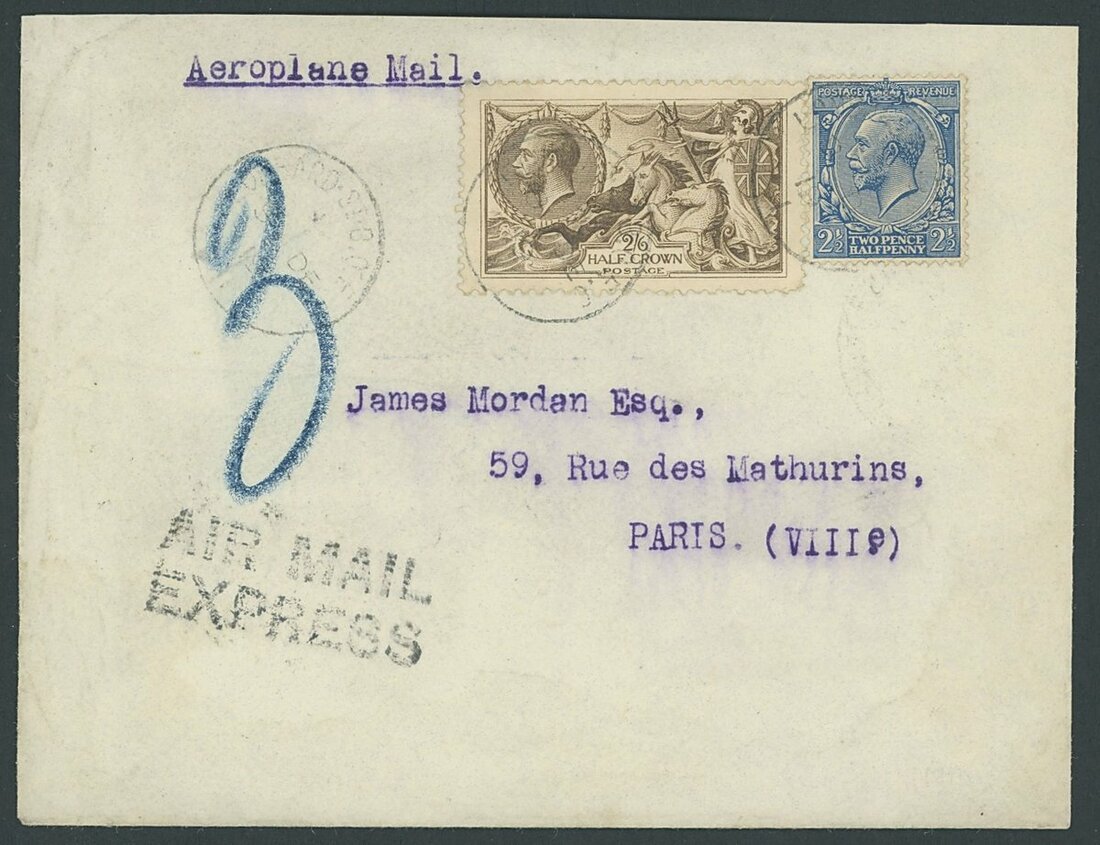 2/6d. pale brown affixed alongside 2½d. blue and tied by indistinct d.s. to 1919 (Dec.) envelope from London to Paris with manuscript "3" and "