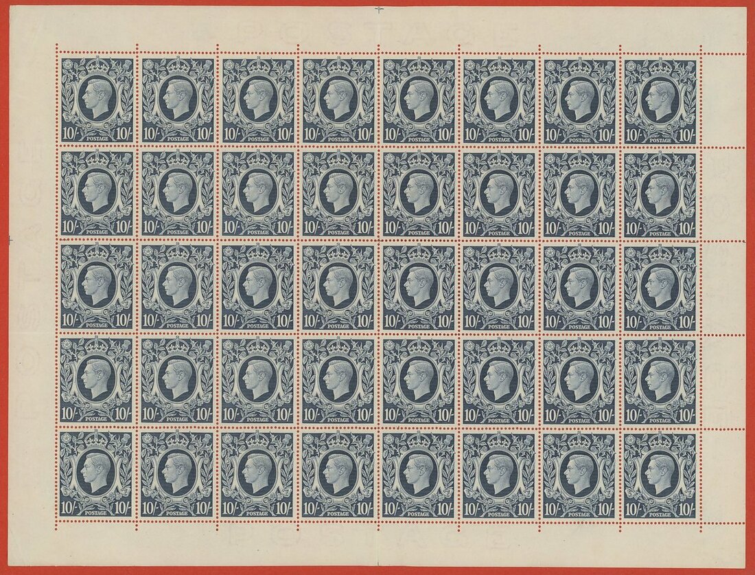 10/- dark blue complete, unmounted mint sheet of forty; a couple of minor peripheral faults hardly detract, S.G. 478, £10,400.