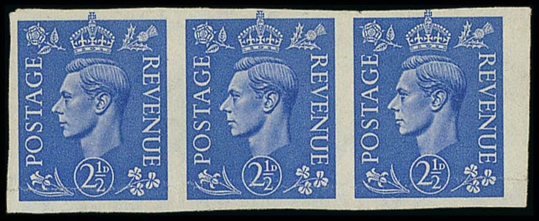 1941-42 2½d. ultramarine horizontal strip of three, variety imperforate, unmounted mint with breaking crease along foot otherwise fine and rare. S.G. 489b, £4,500 as a pair.
