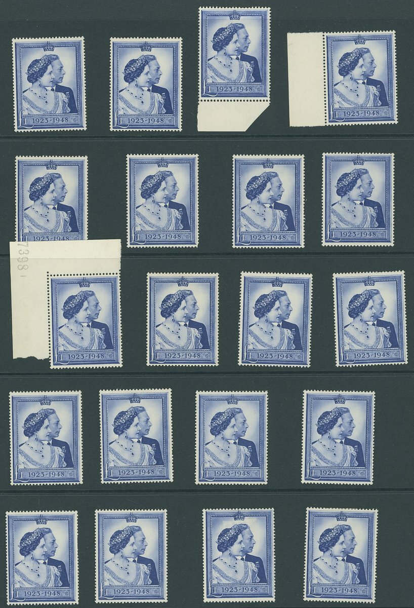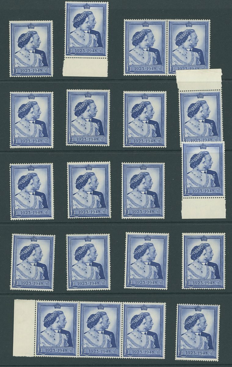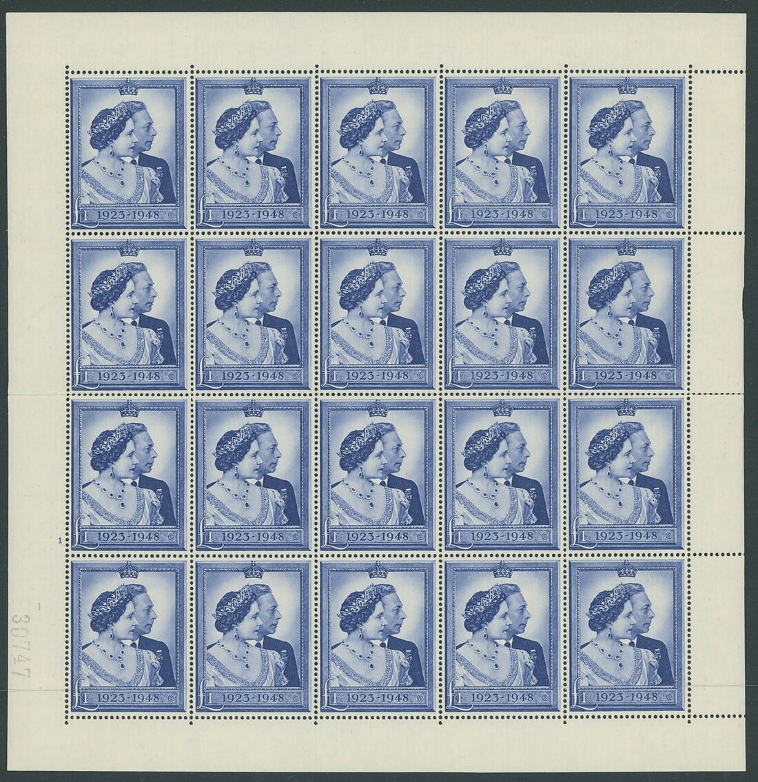 1948 Royal Silver Wedding £1 blue, complete, unmounted mint sheet of twenty, plus further corner marginal block of four, various pairs and singles (the latter including a few with faults/mounted). (78).