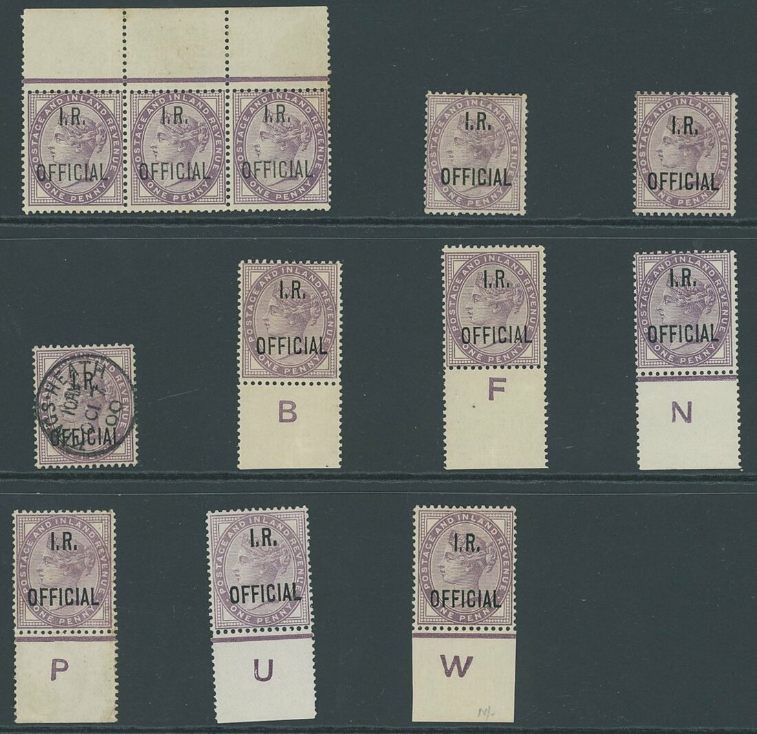 Stamps of 1880-81, 1d. lilac controls 'B', 'F', 'N', 'P', 'U' and 'W', 'N' overprinted in blue-black ink, also horizontal strip of three from the top of the sheet, two mint singles, together with used example cancelled at Kings Heath. Three controls unmounted, two large part original gum, and one without gum. Generally fine and a rare group, Wiseman states very few known, with 'P' only one mint and one used known. Wenvoe or R.P.S. Certificates for 'B', 'N', 'P' and 'U'. S.G. O3, £2,300+