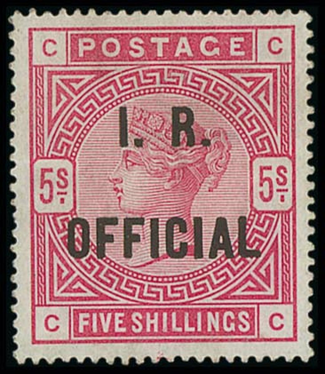 5/- rose on white paper, CC, large part original gum with short bend, fine, of very good colour and centring, and a rare stamp. R.P.S. Certificate (2011). S.G. O9, Spec. L7(2), £6,500