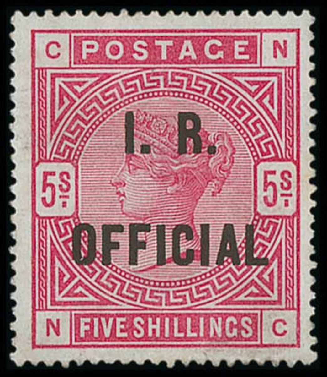 5/- rose on white paper, NC, unused without gum, slight mark at lower left, nevertheless a rare stamp. R.P.S. Certificate (2014). S.G. O9, Spec. L7(2), £6,500