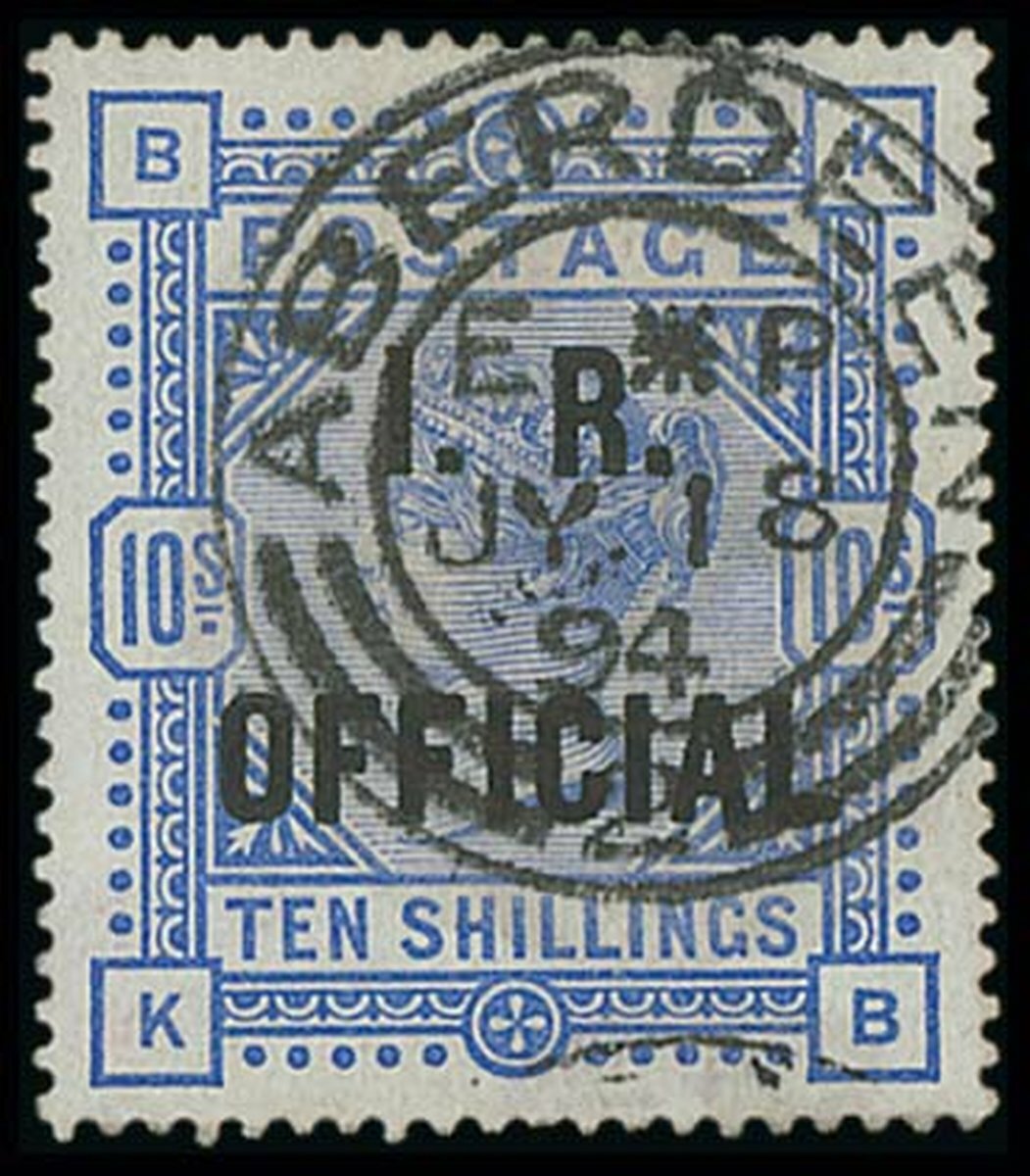 10/- ultramarine on white paper, KB, overprinted in blue-black ink, cancelled by "