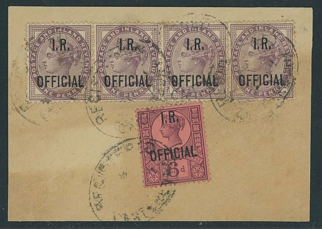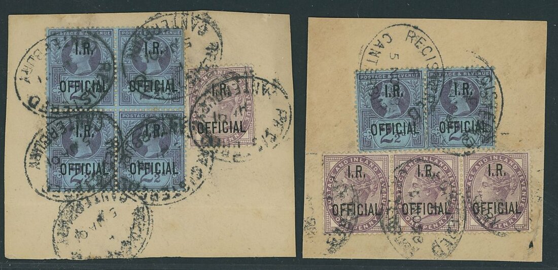1880-81 1d. lilac alongside 1887-92 2½d. purple on blue block of four on piece; 1880-81 1d. lilac strip of three and 1887-92 2½d. purple on blue pair on piece; and 1880-81 1d. strip of four and 1887-92 6d. on piece. All tied by Canterbury registered ovals. Fine and a rare trio. Spec. c.£800+