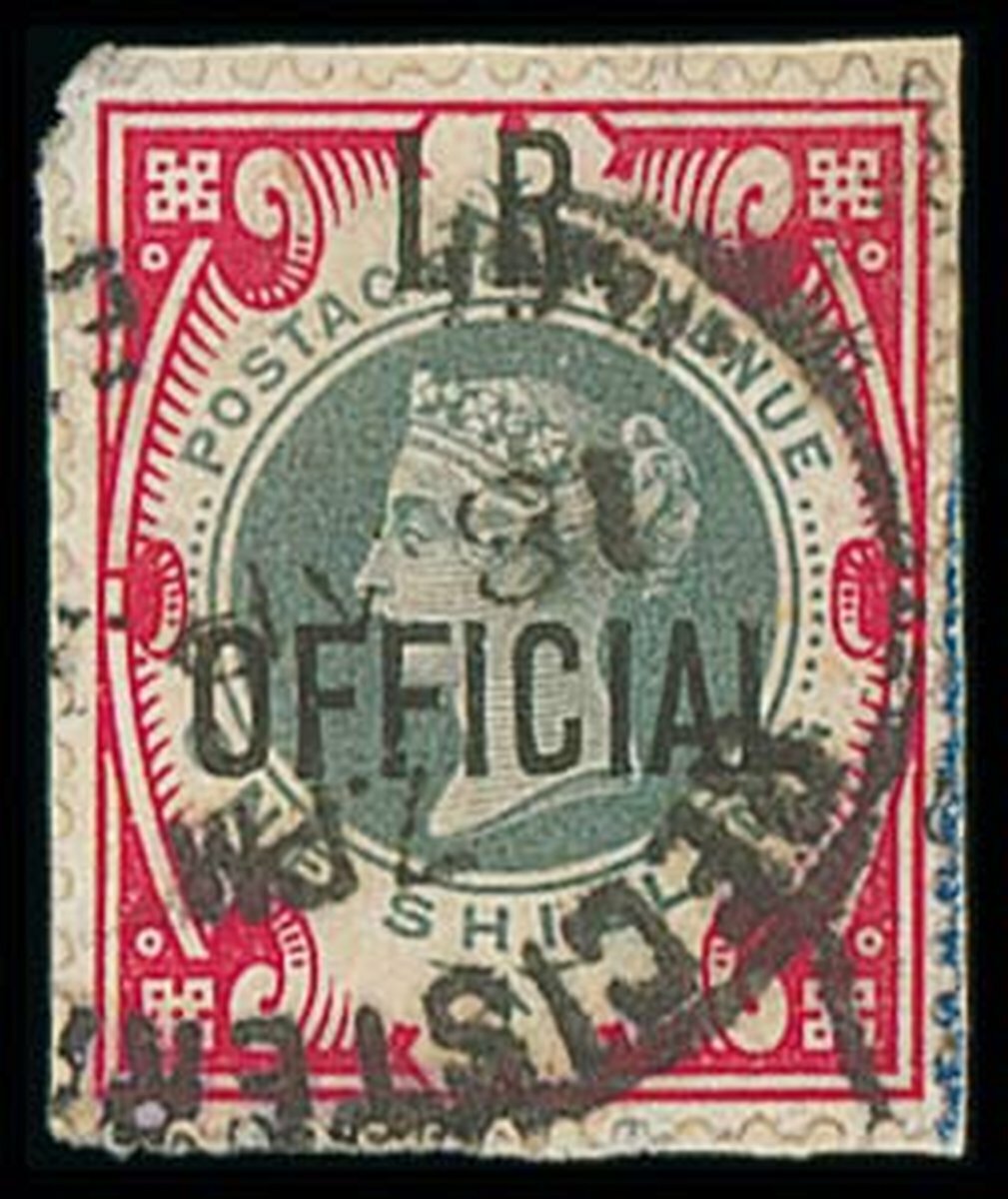 1/- green and carmine, tied to small piece by Registered oval, fine and scarce. Wenvoe Certificate (2019). S.G. O19, Spec. L17, £1,800