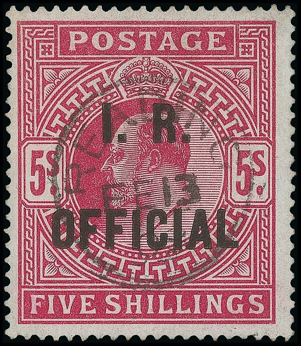 5/- carmine, overinked overprint, lightly cancelled by centrally struck Reading 13.02.03 d.s., very fine used and a rare stamp. B.P.A. Certificate (1991). S.G. O25, Spec. MO6, £10,000
