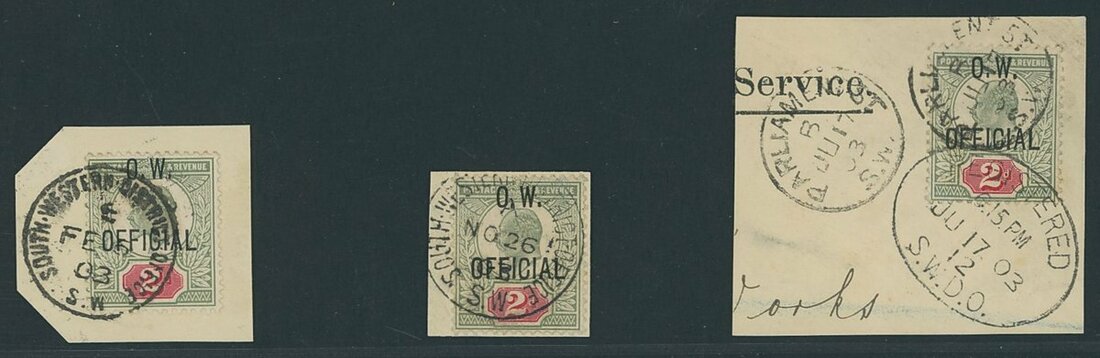 2d. yellowish green and carmine-red, three singles, each on separate piece, two tied by South Western District Office d.s., one with large stop after "
