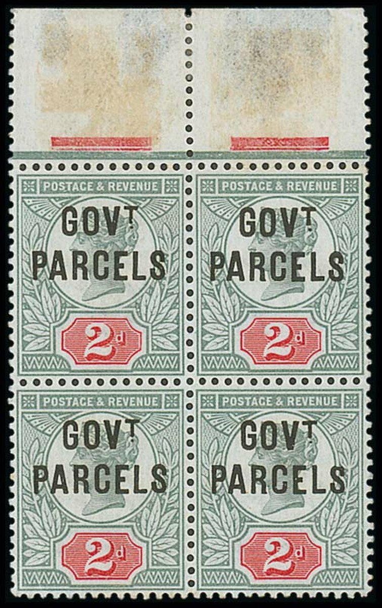 2d. grey-green and carmine block of four from the top of the sheet; mounted on face of margin only (previously folded behind), leaving the adhesives unmounted mint, the lower left stamp with slight gum wrinkle mentioned for the sake of total accuracy. A very fine and fresh block. R.P.S. and Warwick and Warwick Certificates (2007, 1977) S.G. O70, L25, £1,400