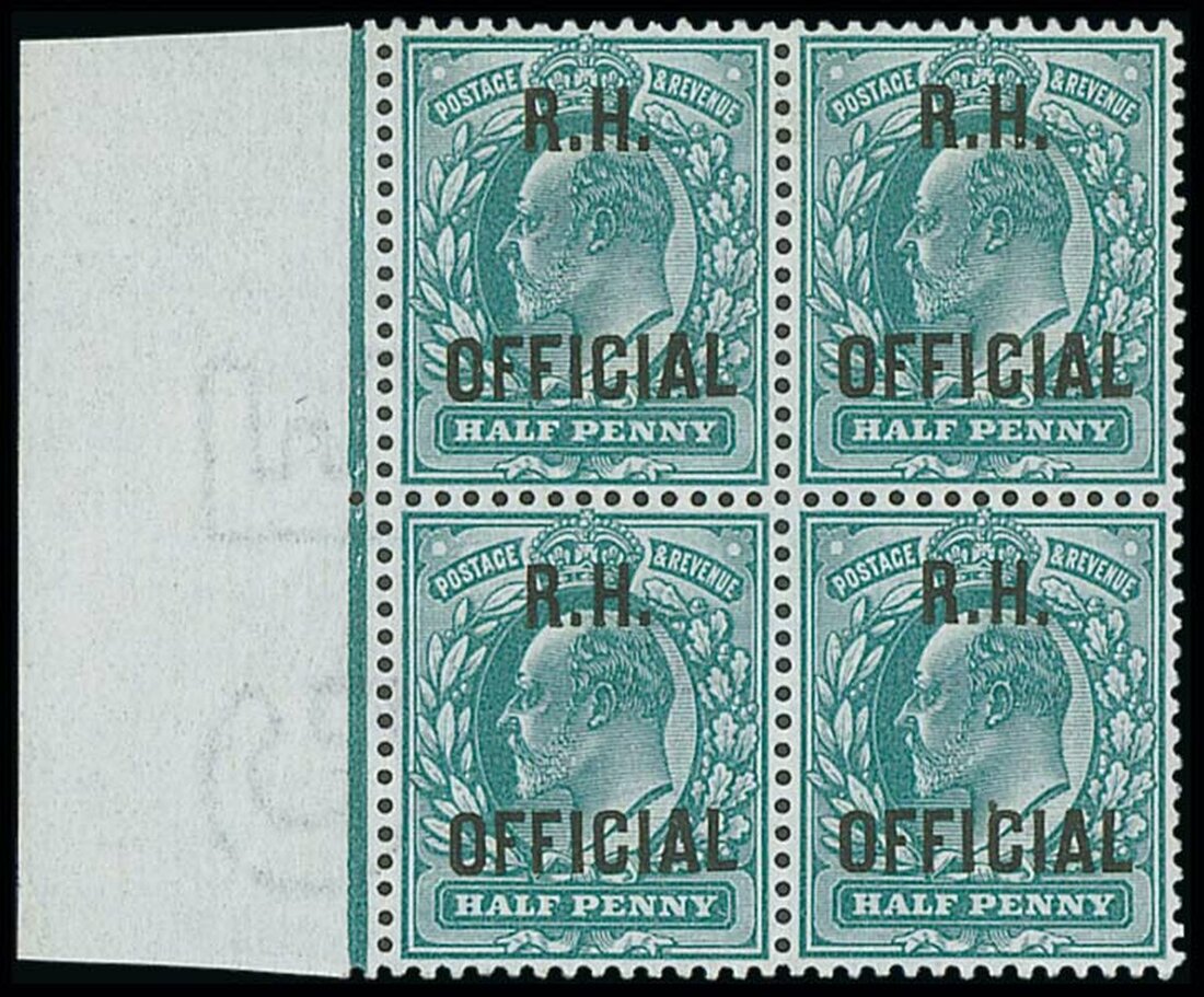 ½d. blue-green marginal block of four with sheet margin at left, unmounted mint, short wrinkle in margin only, stopping short of the adhesives, very fine and rare. R.P.S. Certificate (2015). S.G. O91, Spec. MO28, £2,000
