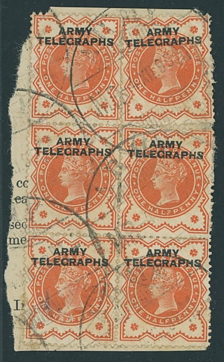 Overprinted for use in British Army Field Offices During South African War, 1899-1902: 1899-1900 ½d. vermilion block of six (2x3), the upper right hand stamp separated, tied to small piece by 04.12.1899 d.s., some small faults though a scarce usage. S.G. AT1, £180+